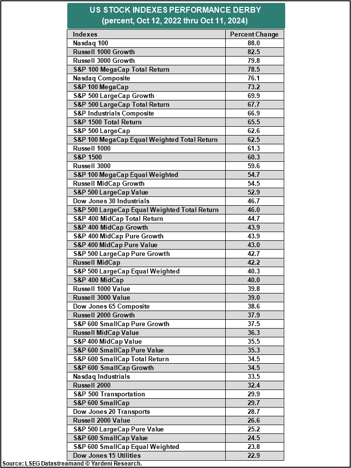 Among the bull market's skeptics were those who claimed that it was too narrowly based on the stock prices of the Magnificent-7. They warned that a narrow bull market isn't likely to be a sustainable one. We argued that the bull market would broaden as recession and inflation fears both abated, allowing the Fed to pivot from a hawkish to a dovish monetary stance. And so has it been. Indeed, since October 12, 2022, all of the major US stock market indexes are up at least 20% (table).