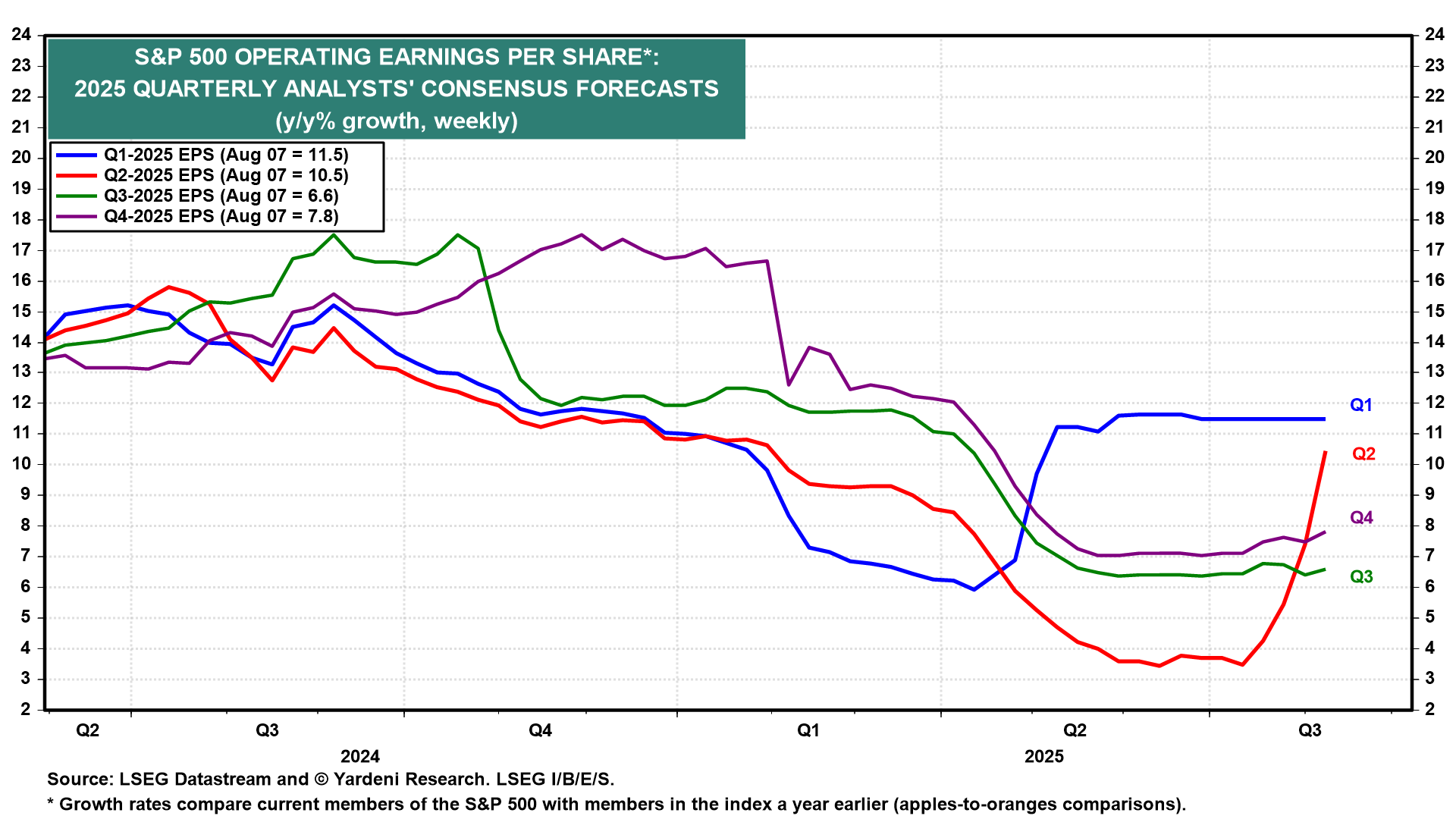 Better-than-expected earnings reported by the Magnificent-7 contributed to the better-than-expected earnings results of the S&P 500 companies in aggregate during Q1 and Q2 (chart). Q1's earnings rose almost twice as fast as was expected just before the earnings reporting season. Q2's growth rate may be on track to be three times greater than expected.