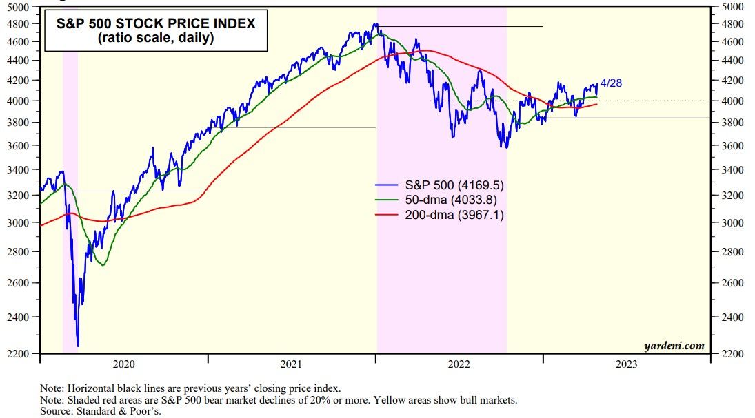 In our opinion, the S&P 500 may continue to churn around 4000 through the summer before resuming the bull market that started on October 12, 2022, more than six months ago (chart). Arguably, it has been churning around 4000 since last summer. Last week, it bounced off its 50-dma and closed near its February 2 high.