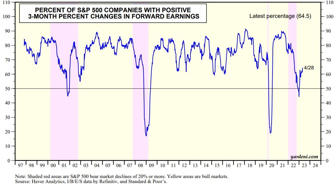 Meanwhile, our three-month measure of the breadth of S&P 500 forward earnings rose to a new high for this year of 64.5% during the April 28 week (chart). It bottomed at the end of last year at 45.0%. Analysts apparently read the recession memo and weren't convinced based on the relatively upbeat guidance offered by the managements of many of the companies they follow.