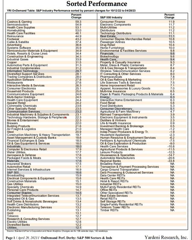 The bull market's detractors say that the breadth of the rally in the S&P 500 has been narrow with the MegaCap-8 stocks leading the way. Collectively, these stocks currently account for 24% of the market capitalization of the S&P 500. That's all true, but there are plenty of industries that don't include any of the MegaCap-8 that are up over 20% since October 12, 2022 (table).