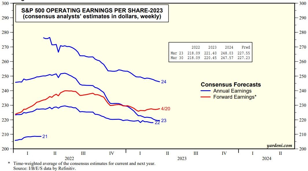 The S&P 500 has been range bound lately partly because its forward earnings has flattened out in recent weeks after falling during H2-2022 and the first few weeks of this year (chart).