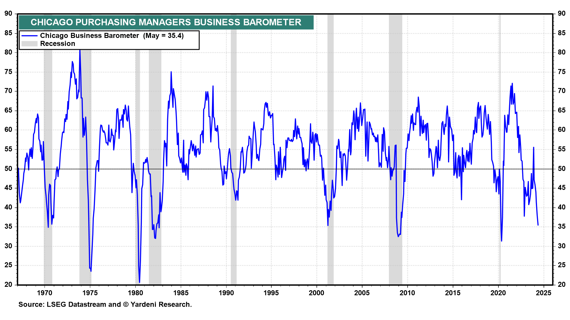 Friday was another wild ride on the S&P 500 rollercoaster. At first, stock prices rose after April's PCED inflation rate released at 8:30 am matched expectations. But then they dropped after a recessionary reading in May's Chicago Purchasing Managers Business Barometer at 10:00 am (chart).
