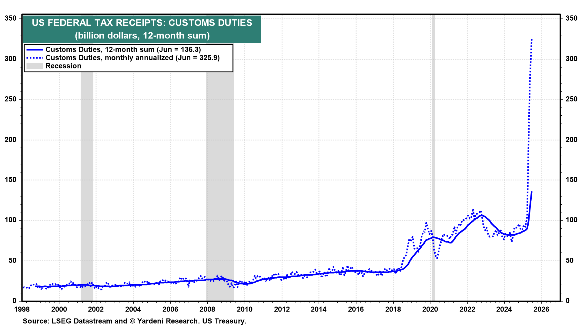 President Donald Trump is on a roll. He now has 33 trade deals—with the UK, China, Vietnam, Indonesia, the Philippines, Japan, and the 27 countries that are members of the European Union (EU). The EU deal was announced today. The deals show that Trump has raised his baseline tariff to 15% from 10%. He must figure that, in addition to his other tariffs, the US should collect at least $400 billion per year in import duties (chart). If so, these revenues will significantly help reduce the federal deficit.