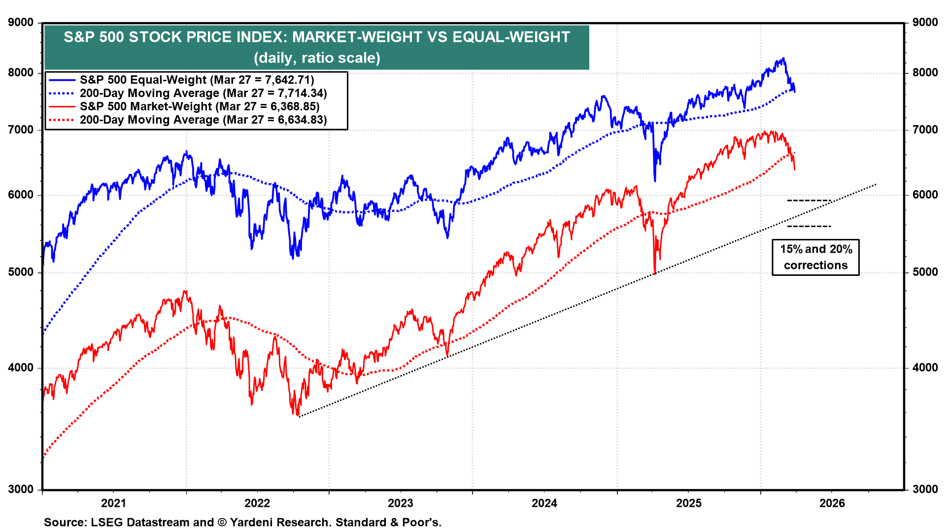The S&P 500 is down 8.7% from its record high on January 27 (chart). It fell below its 200-day moving average last week. A 15% correction would take the index down to 5930.81. The S&P 500 equal-weighted index slipped just below its 200-dma on Friday. (The dotted lines on the chart mark the 15% and 20% correction thresholds for the market-cap weighted index.)