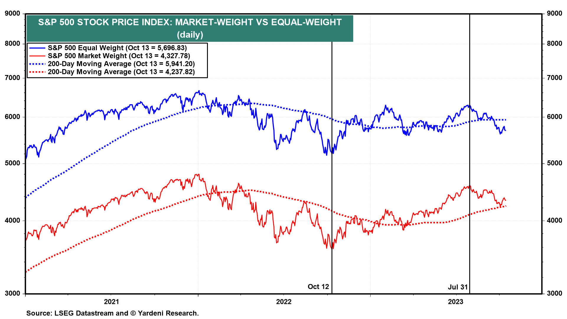 These worries have weighed on the stock market. Since July 31, the S&P 500 market- and equal-weight indexes are down 5.7% and 9.4% (chart). They are still up 21.0% and 9.5% since October 12. In early August, we suggested that July 31 might have been a short-term top with a likely S&P 500 decline to its 200-day moving average. hat worked out. Now. we think that the market will remain weak for a while longer but still manage a yearend rally which should continue into next year.