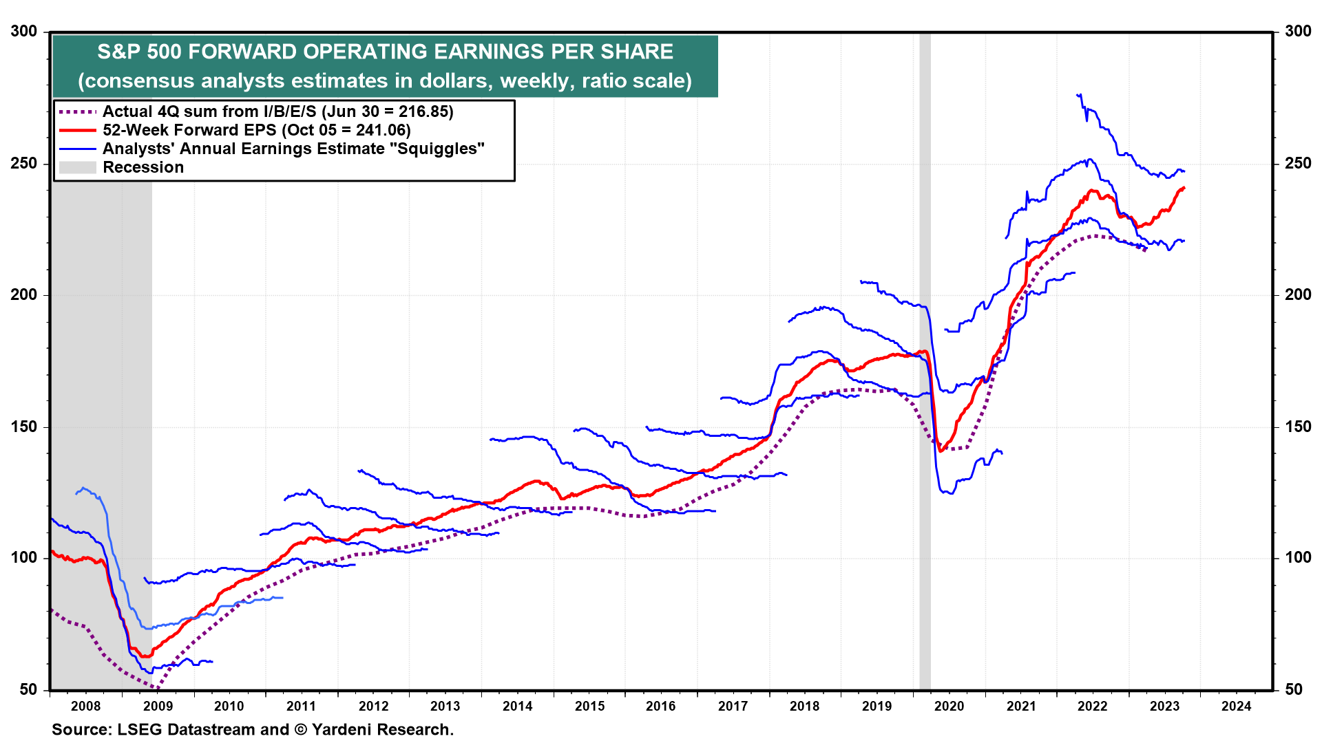 The economy has been resilient. S&P 500 earnings probably rose to a record high during Q3. Analysts' consensus S&P 500 forward earnings per share rose to a new record high during the October 5 week (chart). In our outlook, inflation should continues to moderate. The Fed may be done raising interest rates. The 10-year Treasury bond yield should stabilize between 4.50%-5.00%. Earnings should continue to rise.