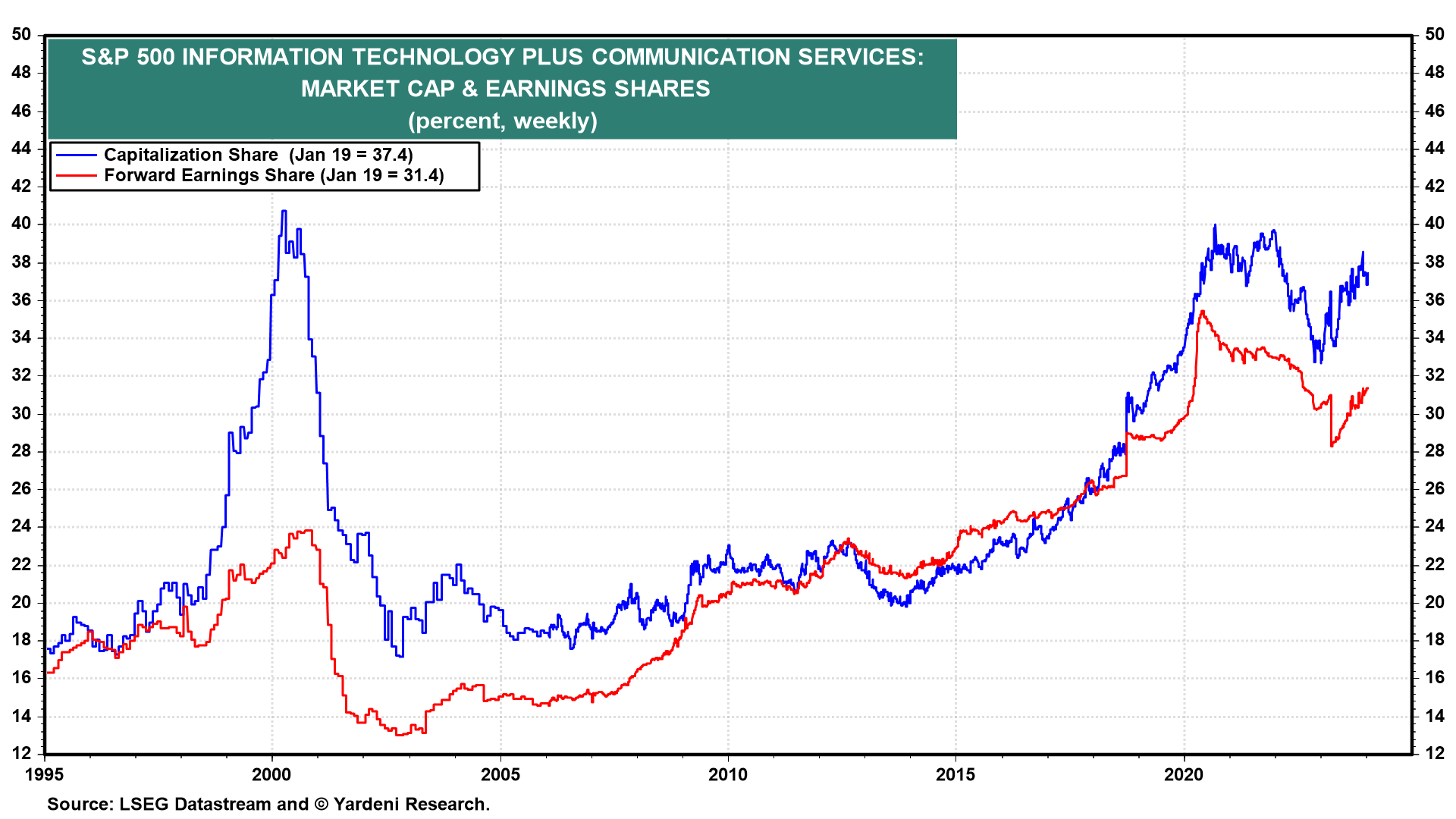 The market capitalization of the S&P 500 Information Technology and Communication sectors together currently account for 37.4% of the S&P 500's market capitalization (chart). This measure soared during the 1990s and peaked in early 2000 at 40.7%. That could be surpassed this time because the sectors' combined earnings share is higher.