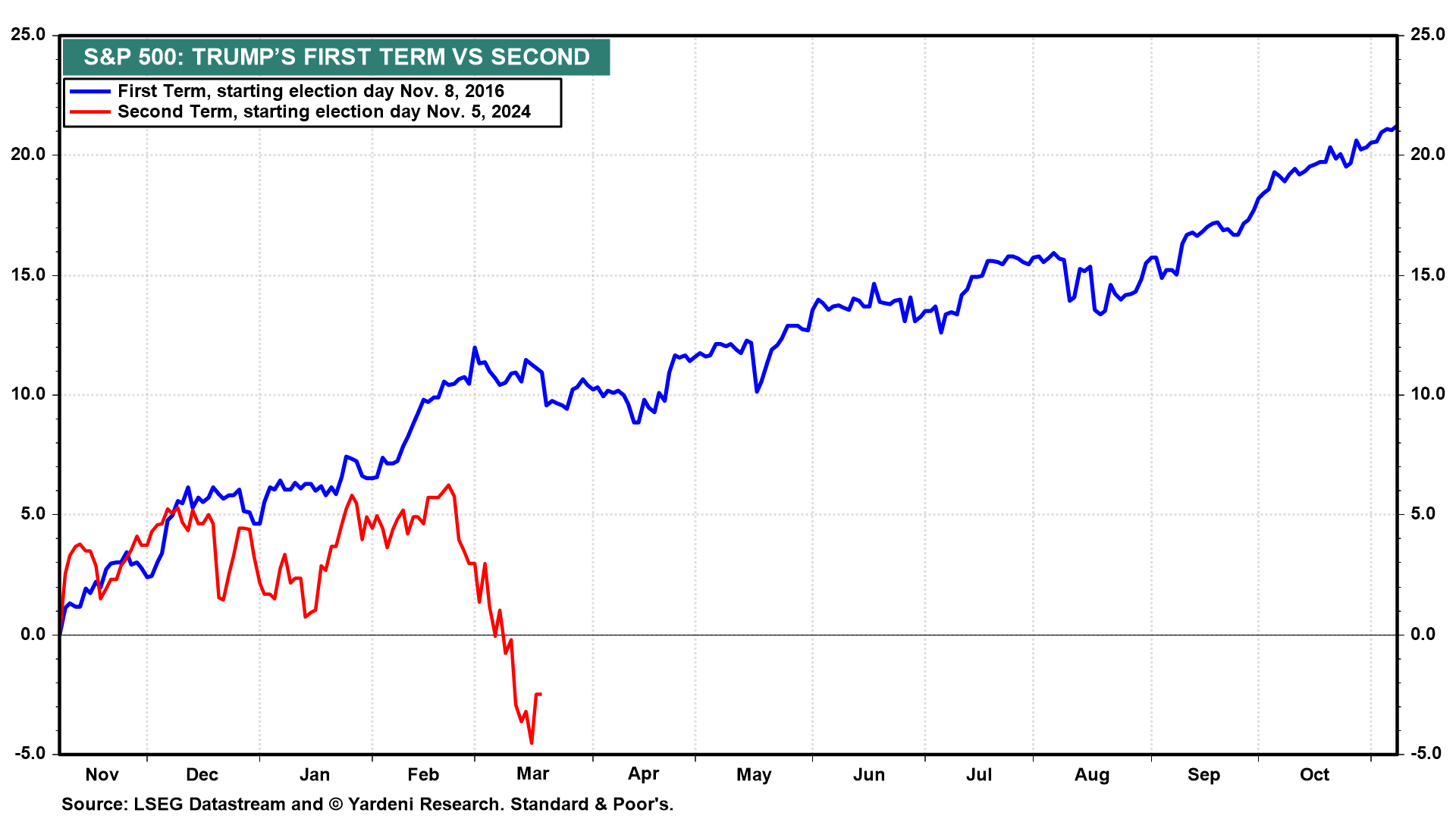 So far among the best Trump trades has been to short the S&P 500 since February 19 through last Thursday (chart). It fell 10.1% over this period. Let's call it the "Trump Thump." We aren't convinced that the correction is over despite Friday's rally and extremely bearish sentiment readings, which tend to be bullish from a contrarian perspective. In the past, such readings often elicited a Fed-Put easing response. That's not likely on Wednesday after the FOMC meets and Fed Chair Jerome Powell holds his presser. He is likely to reiterate that the Fed is in no hurry to lower interest rates.