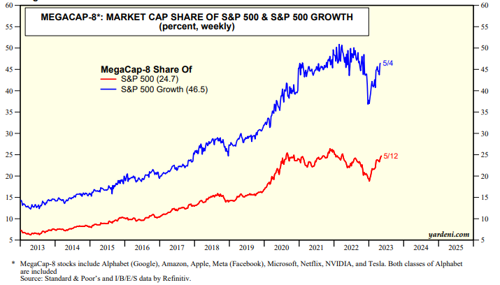 They are back in their saddles again. The Magnificent 8 (a.k.a., the MegaCap-8) have been leading the stock market higher again. They've regained much of the market cap share they lost during last year's bear market, especially in recent weeks. They currently account for 24.7% of the S&P 500 index and 46.5% of the S&P 500 Growth index (chart). As a result, Growth has outperformed Value, LargeCaps has outperformed SMidCaps, and Stay Home has rebounded relative to Go Global.