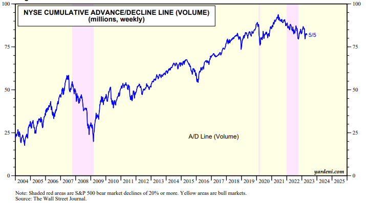 The NYSE advance/decline line rebounded nicely coming out of last year's bear market, but gave back much of the improvement in this measure of breadth as a result of the banking crisis (chart). The S&P 500 has fluctuated around 4000 since last summer. It may continue to do so until the debt ceiling is raised and the banking crisis abates in coming months. Then the bull market should resume in the late summer through the end of this year.