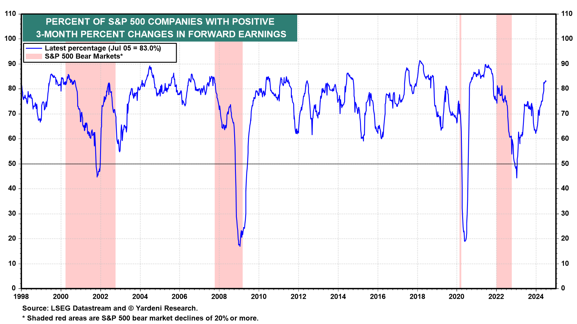 (2) Earnings & stock prices breadth. The percent of S&P 500 companies with positive three-month percent changes in forward earnings rose to a bull-market high of 83.0% during the July 5 week (chart). That argues for a broadening of the stock market's breadth.
