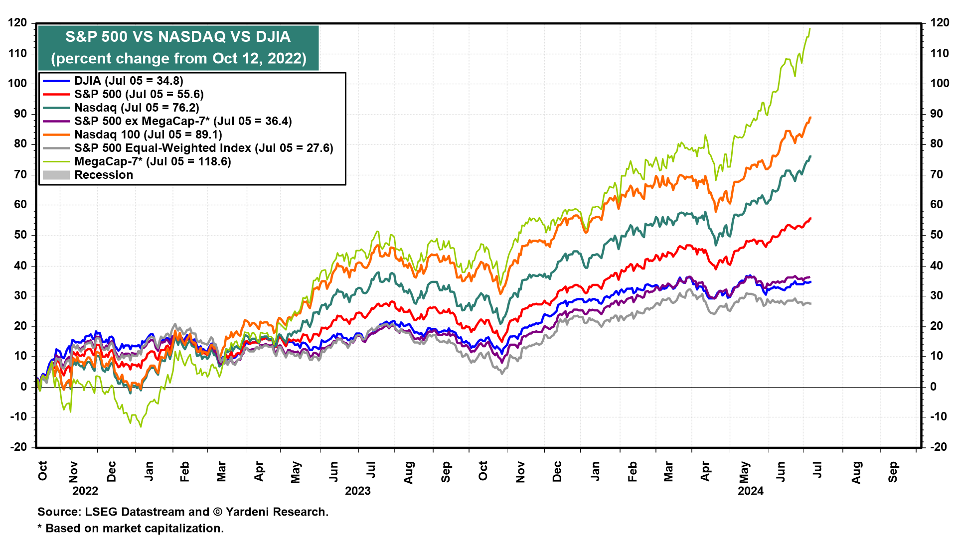 Since the start of the bull market, the S&P 500 is up 55.6% led by the 118.6% increase in the S&P MegaCap-7 (a.k.a., the Magnificent-7) (chart). The S&P 500 excluding the MegaCap-7 is up 36.4% since the start of the bull market. So the S&P 493 have been in a bull market even without the MegaCap-7.