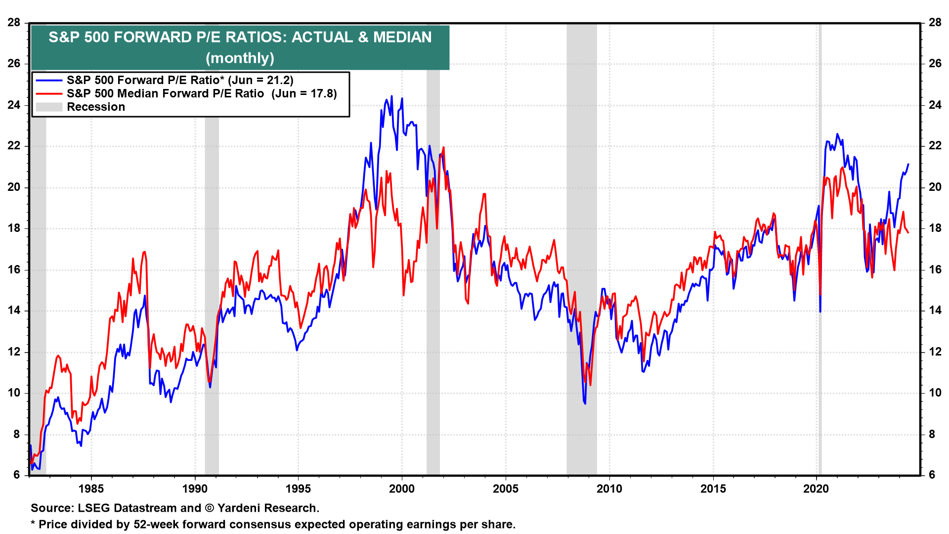 (3) Valuation. The S&P 500's forward P/E measure of valuation is stretched, though that's been largely attributable to the MegaCap-7. During June, the market-cap forward P/E was 21.2 while the median forward P/E was 17.8 (chart). The broad market is not overvalued, in our opinion and could go up on a combination of better earnings and a higher valuation multiple through the end of the decade.