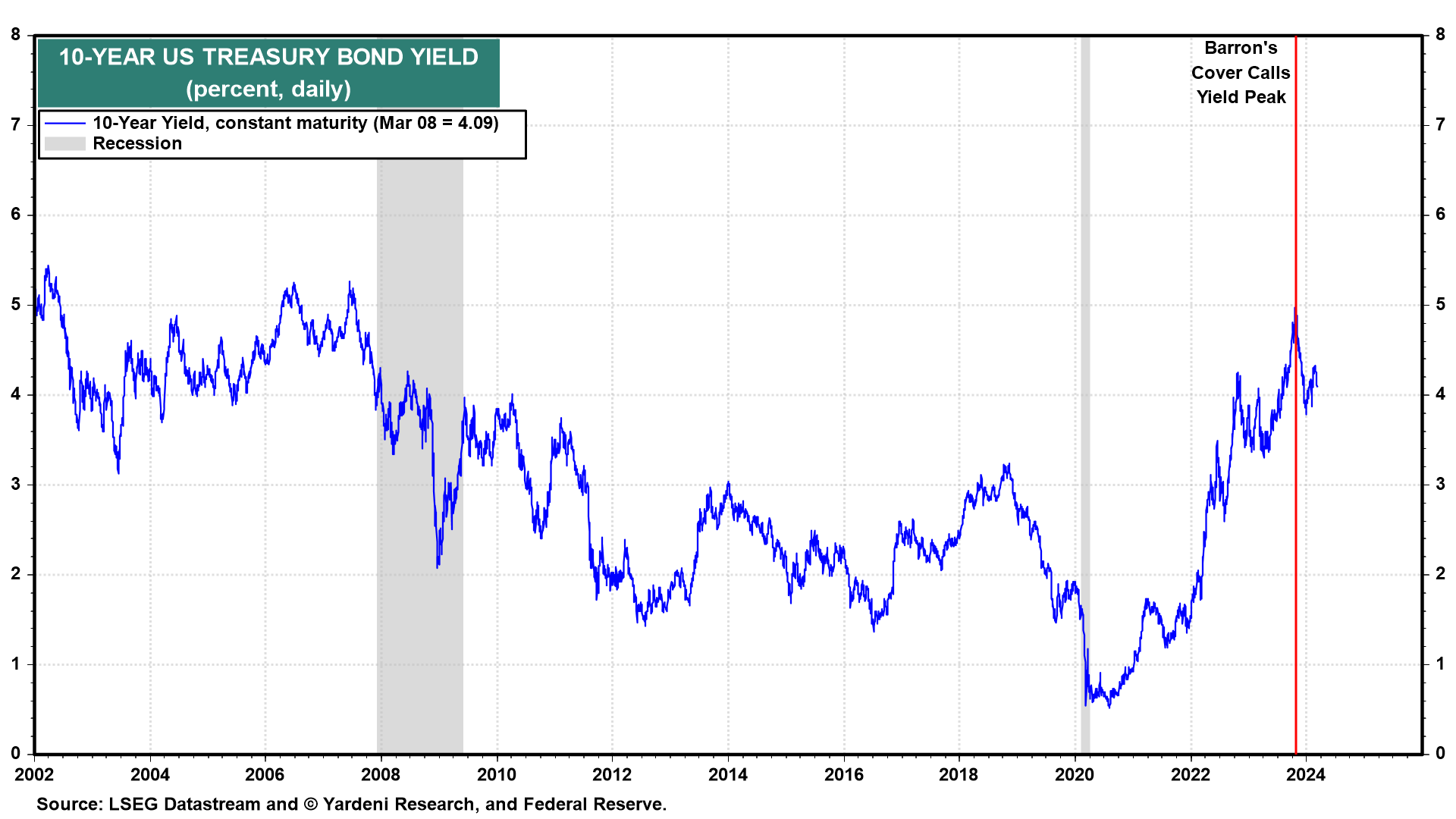 To their credit, our friends at Barron's ran a remarkably prescient cover story on October 27, 2023 titled "It's Time to Stop Crying About Bonds and Buy Them Instead." That was truly among the great calls in financial market forecasting history. We started to like bonds at 4.25% last year before they spiked up to 5.00% near the end of October. We then thought that buyers would be attracted to such a high yield. They were and now the yield is back down to 4.09% (chart). We are neutral on bonds figuring they will trade between 3.75% and 4.25% for a while.