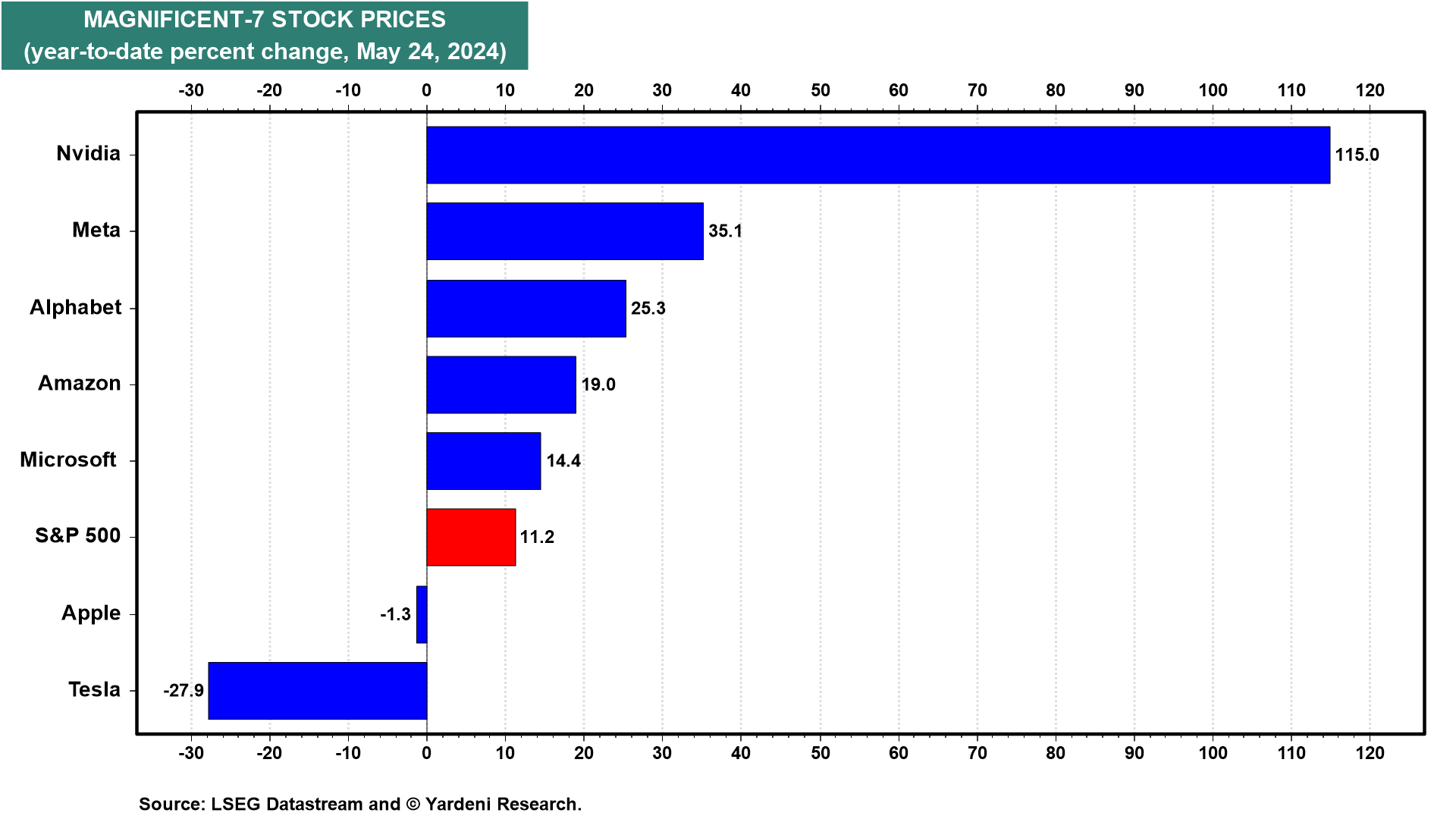 Stock market pundits have been bemoaning the narrowness of the current bull market that started on October 12, 2022. It has been led by the Magnificent-7. Now the pundits are fretting that it is being led by just Nvidia, which is up 115.0% ytd versus 11.2% for the S&P 500 (chart). It is also significantly outperforming the Magnificent-6 so far this year.