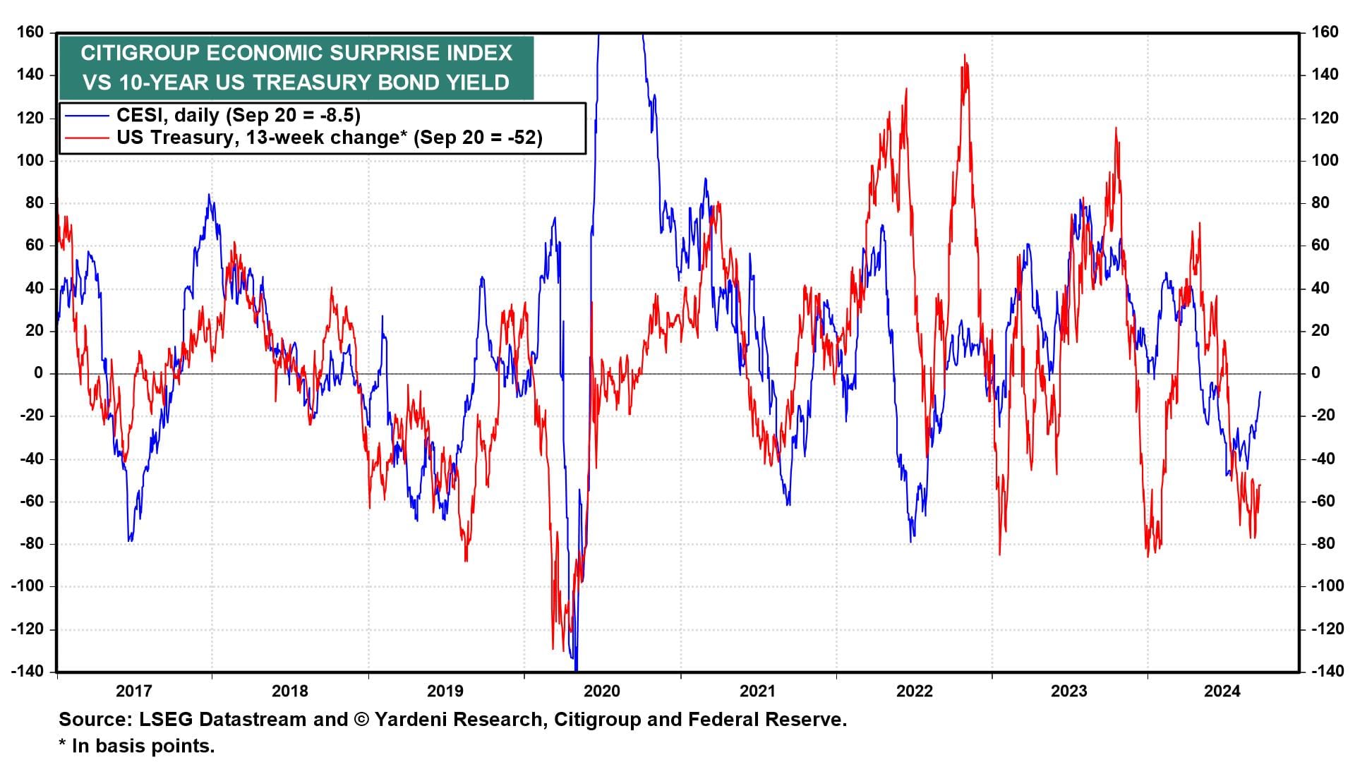 So far, the big surprise has been a positive one for the stock market: The Fed cut the federal funds rate (FFR) by 50bps rather than 25bps on September 18. On September 2, we wrote that better-than-expected economic indicators are likely to rattle bonds more than stocks. That seems to be happening. Consider the following developments: