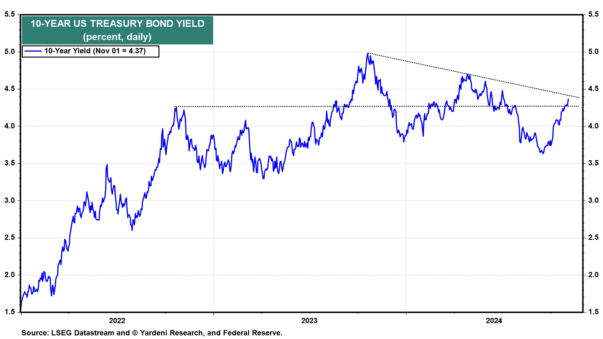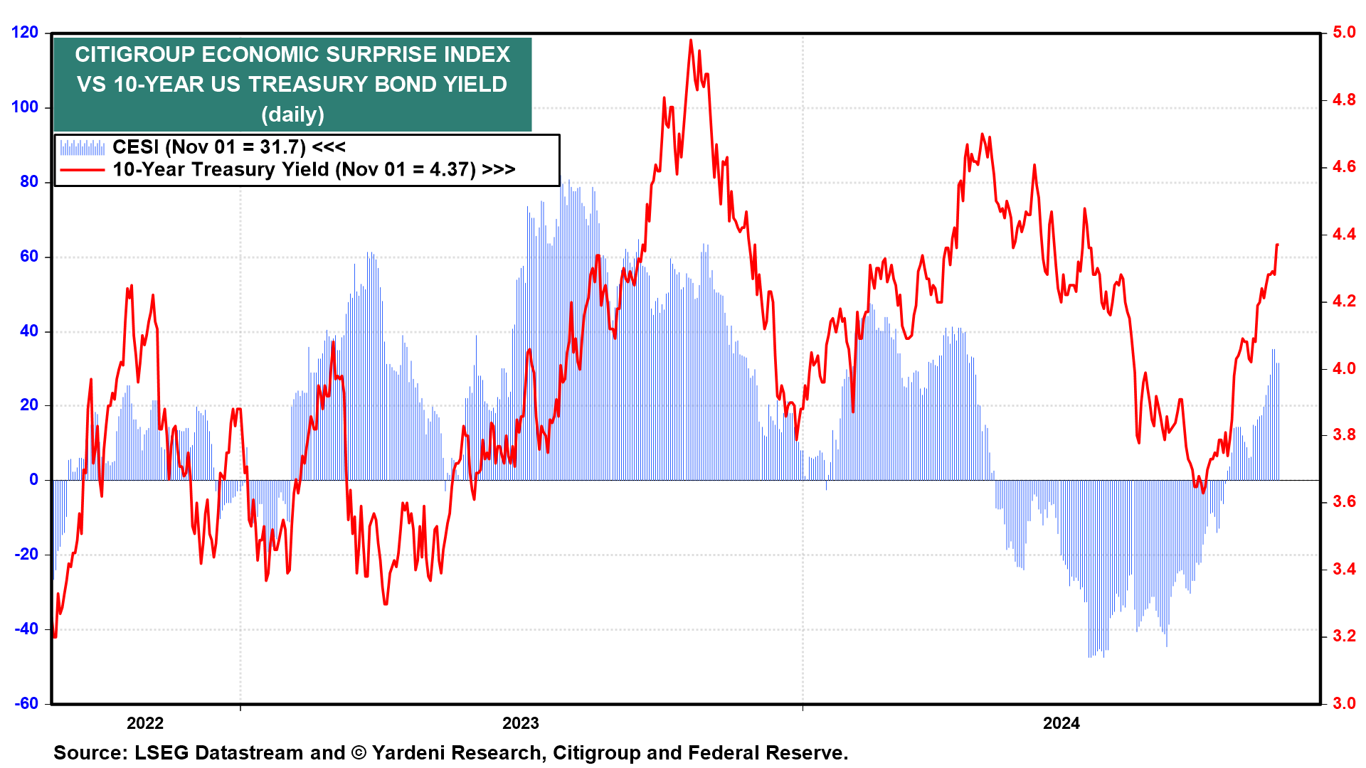 The bond yield has been rising on better-than-expected economic numbers, as we anticipated (chart). We actually turned more bearish on bonds after the Fed cut the federal funds rate by 50bps on September 18, figuring the Fed was stimulating an economy that didn't need to be stimulated. That's especially true since fiscal policy remains stimulative and may continue to be so with the new incoming administration. The bond market seems to agree with our assessment.