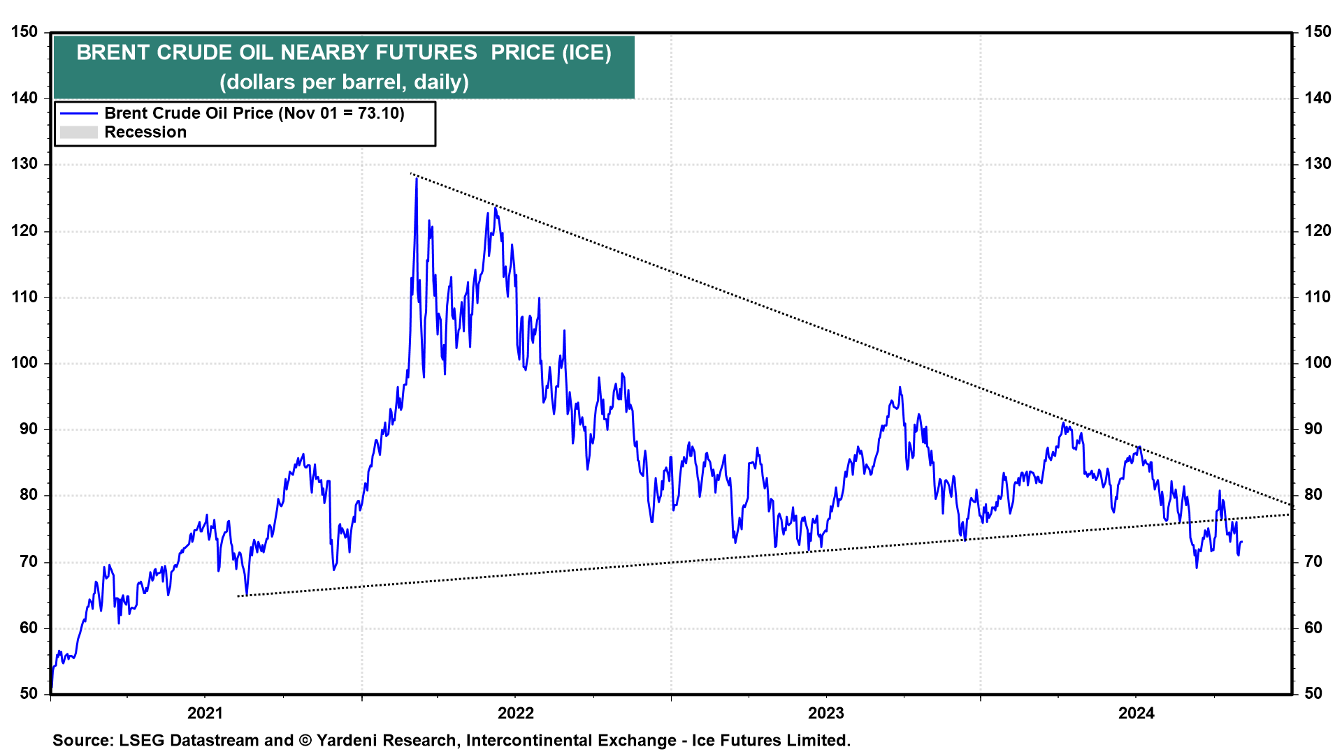 (2) Oil. Often in the past, the bond yield has had a positive correlation with the price of oil mostly because the expected inflation spread between the 10-year nominal bond yield and the comparable TIPS yield is highly correlated with the price of oil, which makes sense. In recent weeks, despite the escalating war in the Middle East, the price of oil has been weak reflecting the lackluster global economy (chart). Yet the bond yield has risen sharply along with the expected inflation spread. Investors are worrying that the Fed is easing too much too soon, thus raising the risk of reviving inflation.