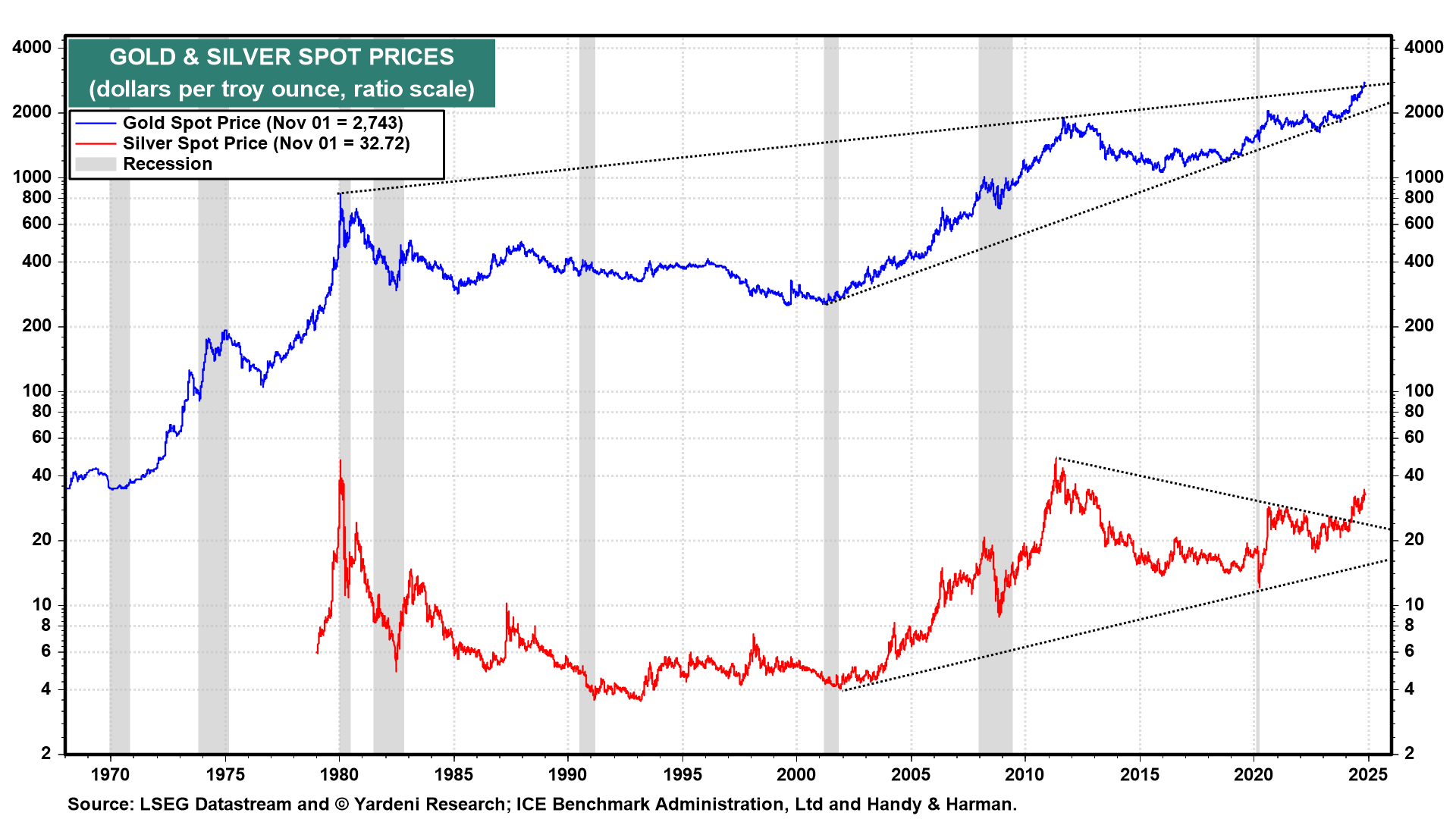 (3) Gold. Gold is a hedge against inflation, domestic political instability, and geopolitical crises. Gold was trading around $1900 per ounce when Russia invaded Ukraine in February 2022. The US and its allies slapped sanctions on Russia, including freezing the country's currency reserves. Since then, the central banks of America's geopolitical adversaries have been buying more gold. So now the gold price is breaking out above an ascending trendline that started in 1980 (chart)