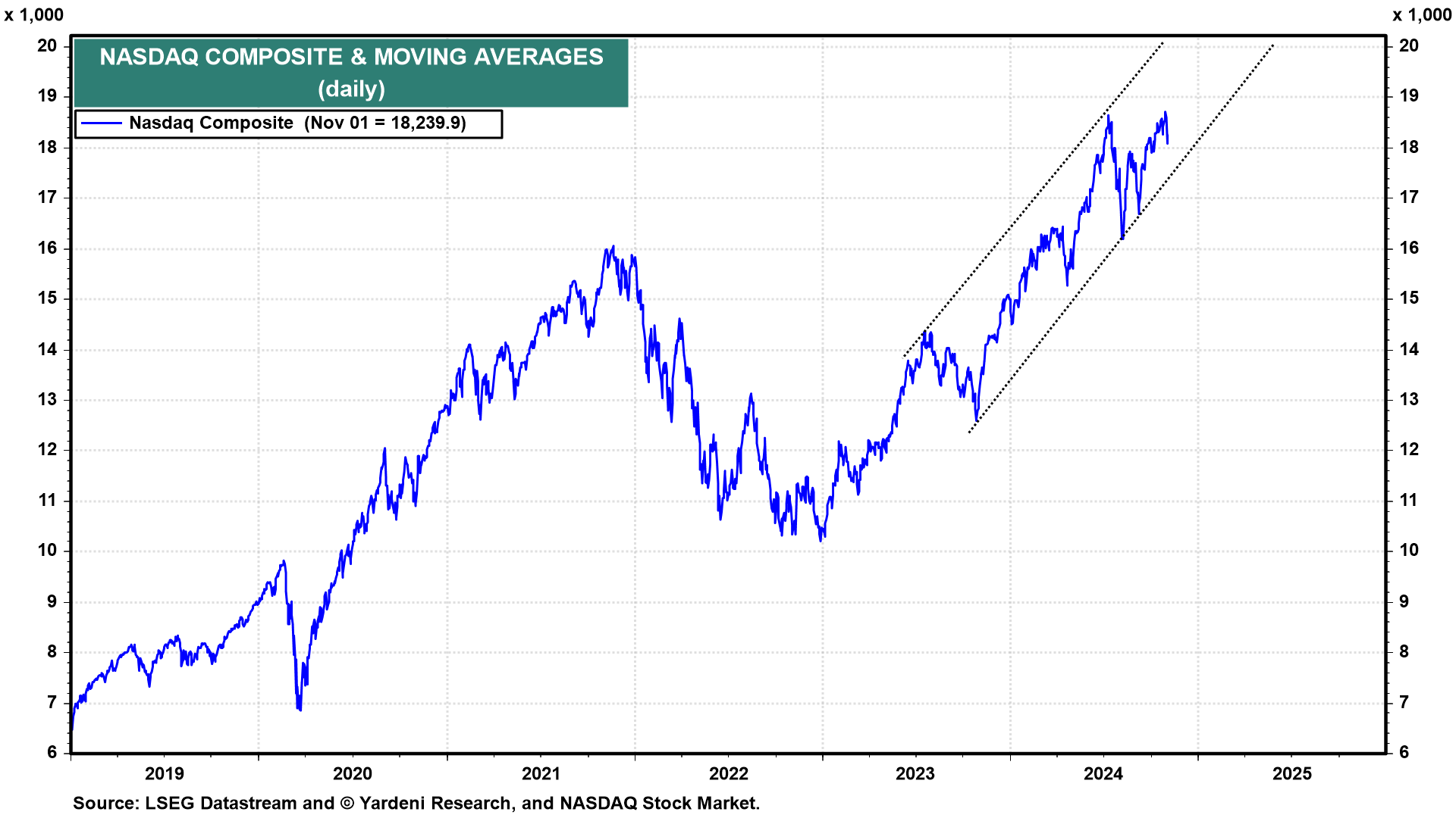 (4) Nasdaq. The Nasdaq composite has been volatile, but trending higher in a channel that started in late 2023 (chart). If it stays in that channel, it should hit 20,000 before May 2025. That's likely to happen in our Roaring 2020s scenario. A backup in the bond yield to 5.00% would undoubtedly depress the Nasdaq and delay such a move by the Nasdaq.