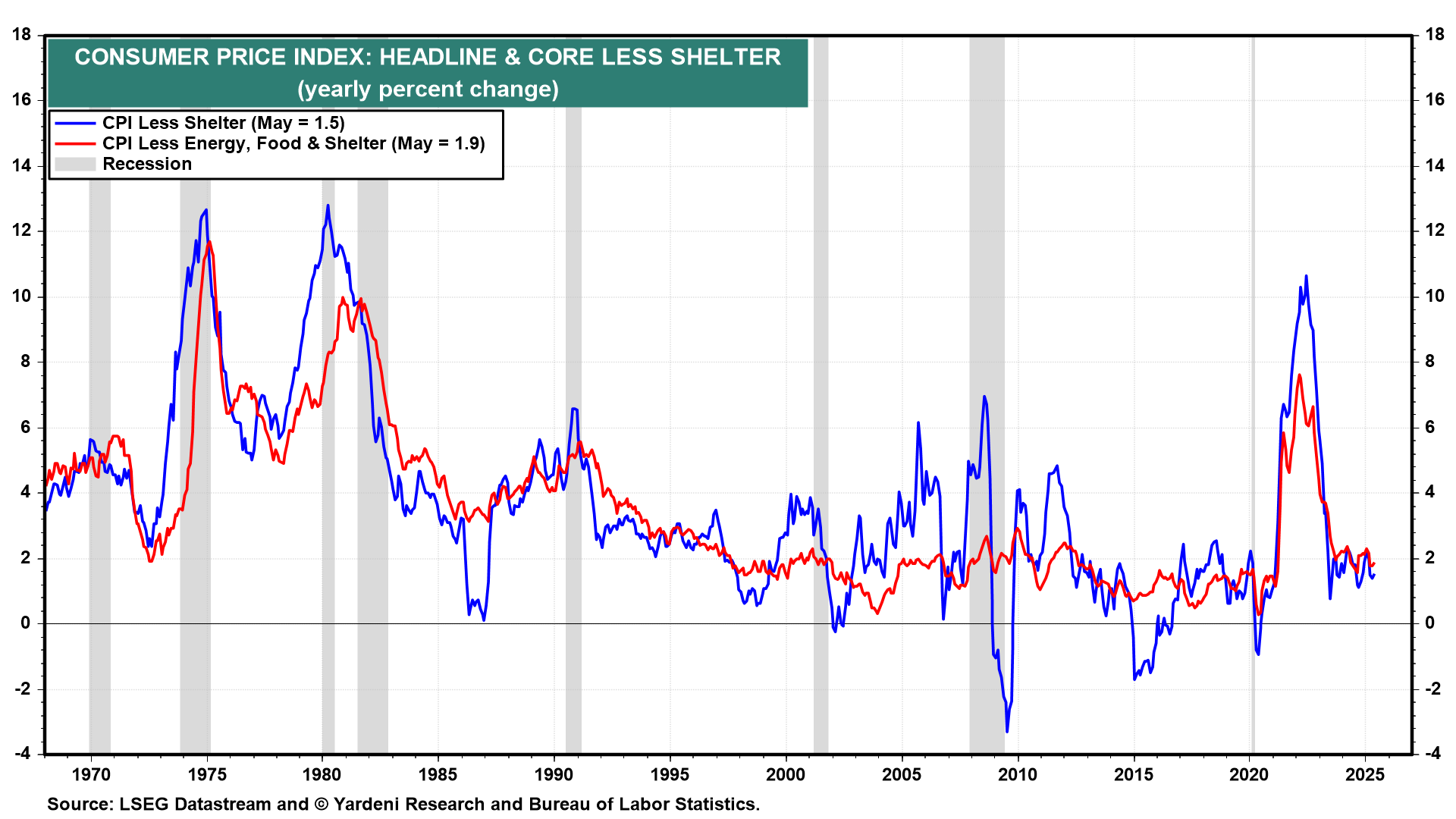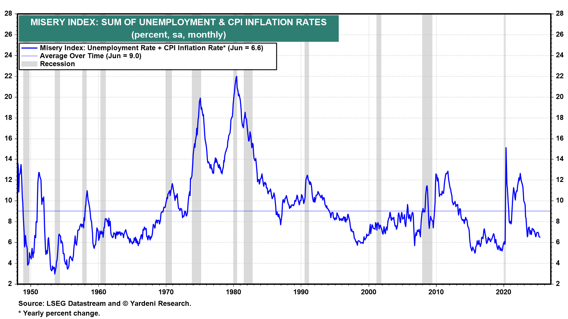 In fact, the economy is in very good shape right now. The labor market is at full employment given that the unemployment rate is 4.1%, and CPI inflation, excluding the slow-motion decline in rent inflation, is below 2.0% y/y (Fig. 1 below and Fig. 2 below). The Misery Index, which is the sum of the unemployment rate and the headline CPI inflation rate, is at 6.6%, well below its average over time of 9.0% (Fig. 3 below).