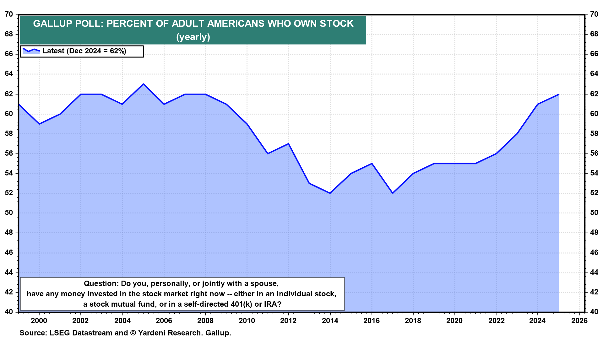 (1) Gallup survey. Trump's tariffs are causing a stock market crash that is hurting millions of Americans, especially the middle class and retired or retiring seniors. Gallup's annual poll of stock ownership shows that 62% of US adults have money invested in the stock market (chart). The vast majority (87%) of upper-income Americans, those with annual household incomes of $100,000 or more, own stock. That compares with 25% of lower-income Americans (those whose annual incomes are less than $40,000). However, two-thirds of middle-income Americans, 65%, own stock.