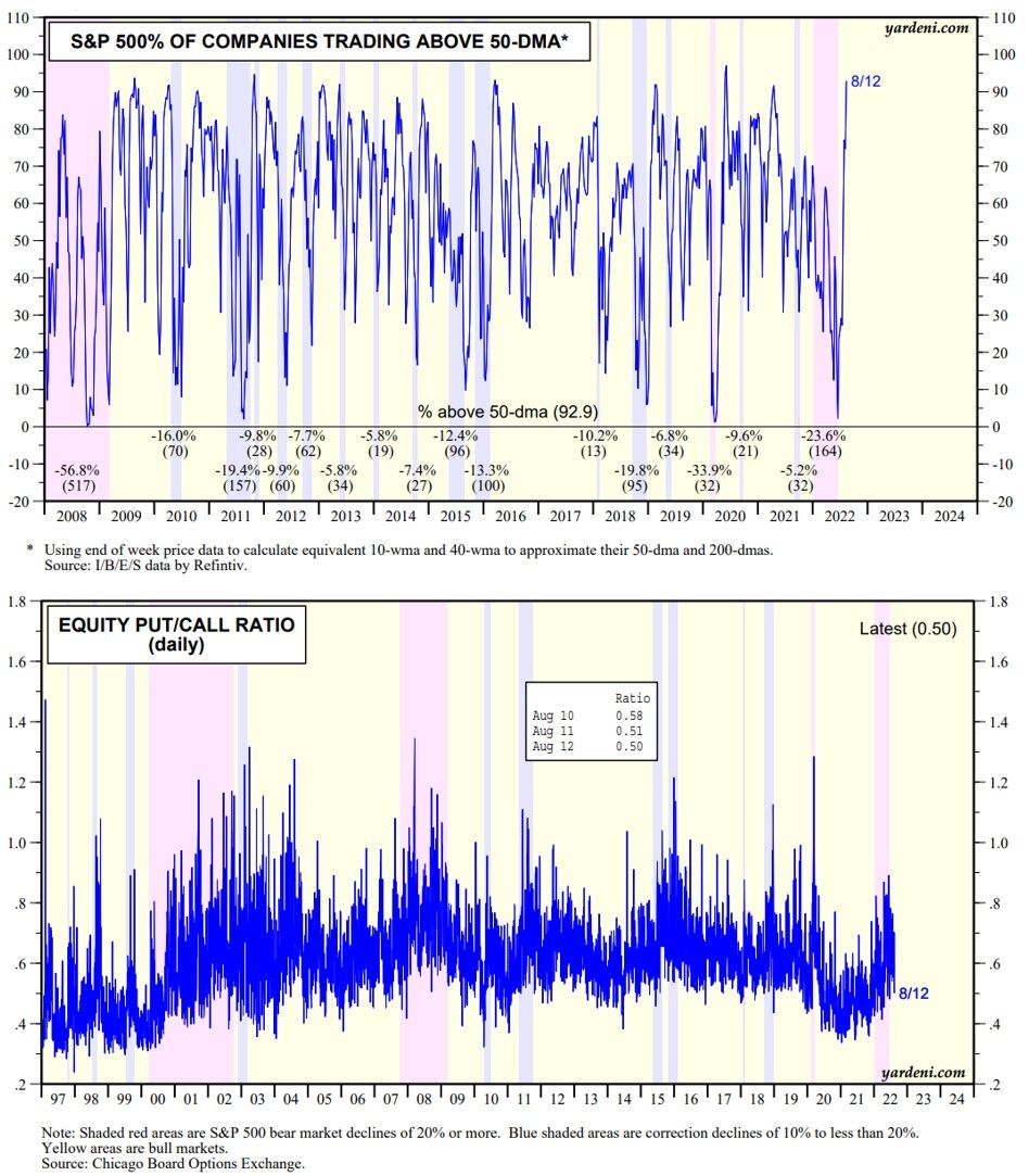The stock market has been rallying since June 16 on mounting expectations that the most widely expected recession of all times might be a no-show and that inflation is peaking. July's strong payroll employment report and peakish CPI and PPI readings suggest that the cat is out of the bag. That's confirmed by several technical indicators: