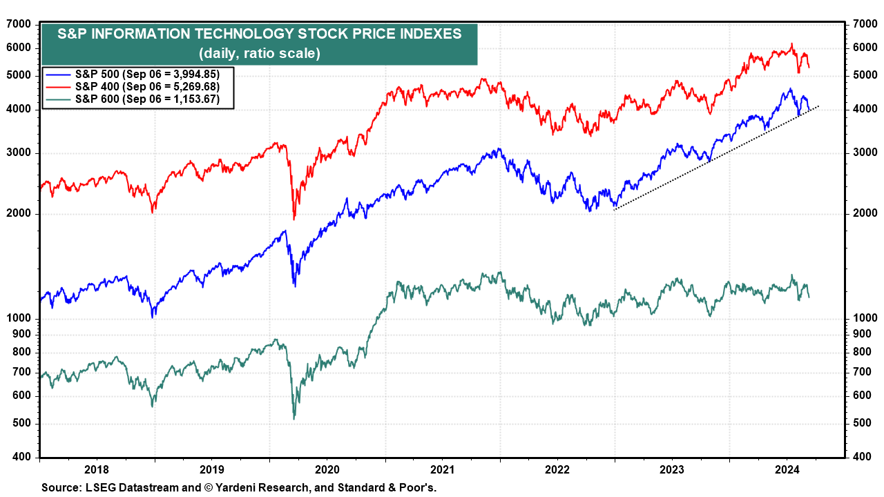 On a ratio scale, the S&P 500 Information Technology stock price index is testing its uptrend line (chart).