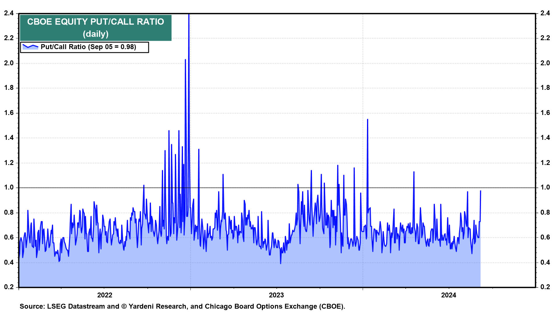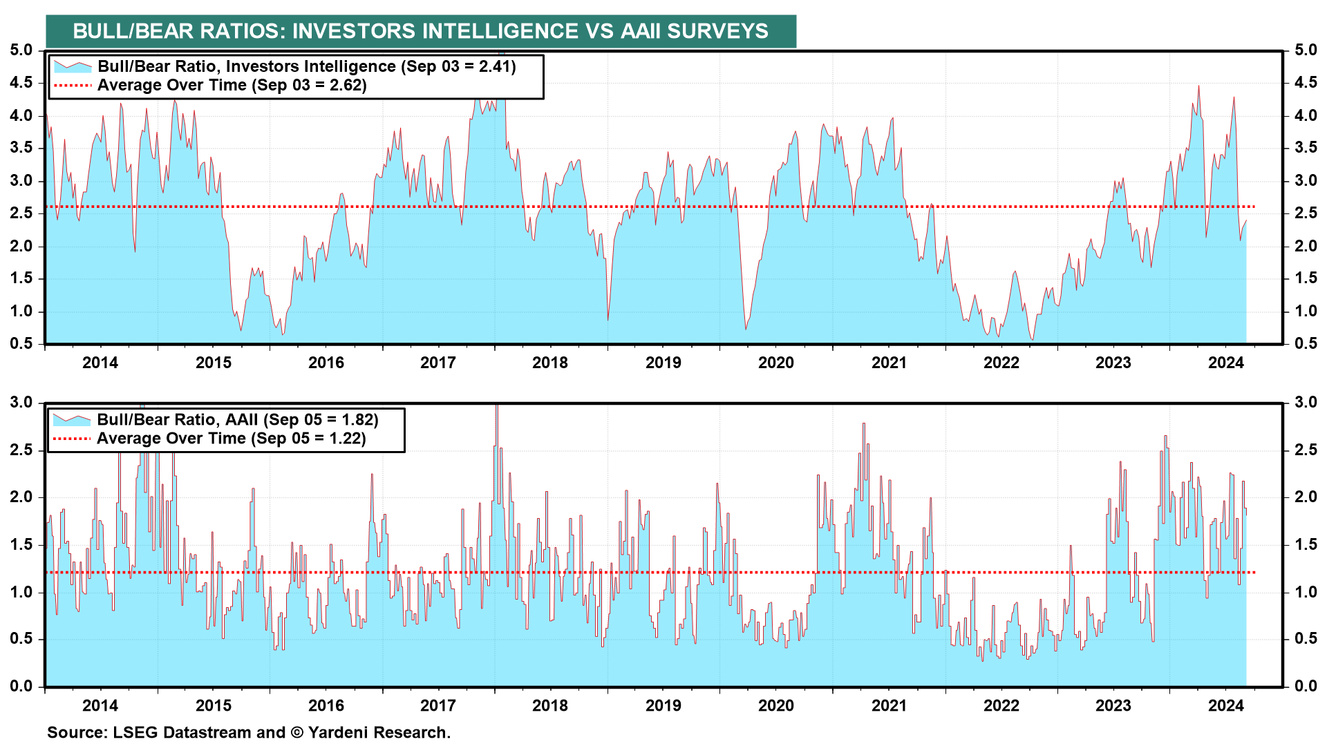 Joe is right: The sentiment indicators have turned less bullish, but perhaps not bearish enough to make a bottom in stock prices. That should change when they are updated with Friday's sentiment, which must have turned more bearish as stock prices plunged (chart).