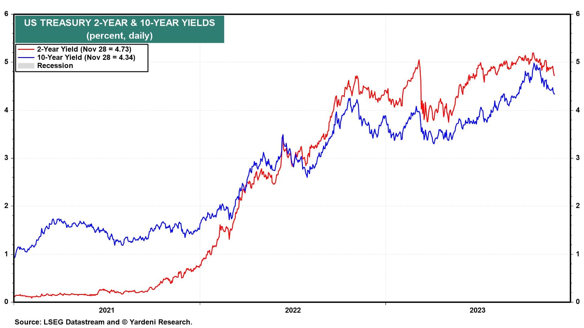 Not much happened in the stock market today even though the 10-year bond yield fell to 4.34% from a high of 4.98% on October 19 (chart). The 2-year yield sank to 4.73%, the lowest since July 17.