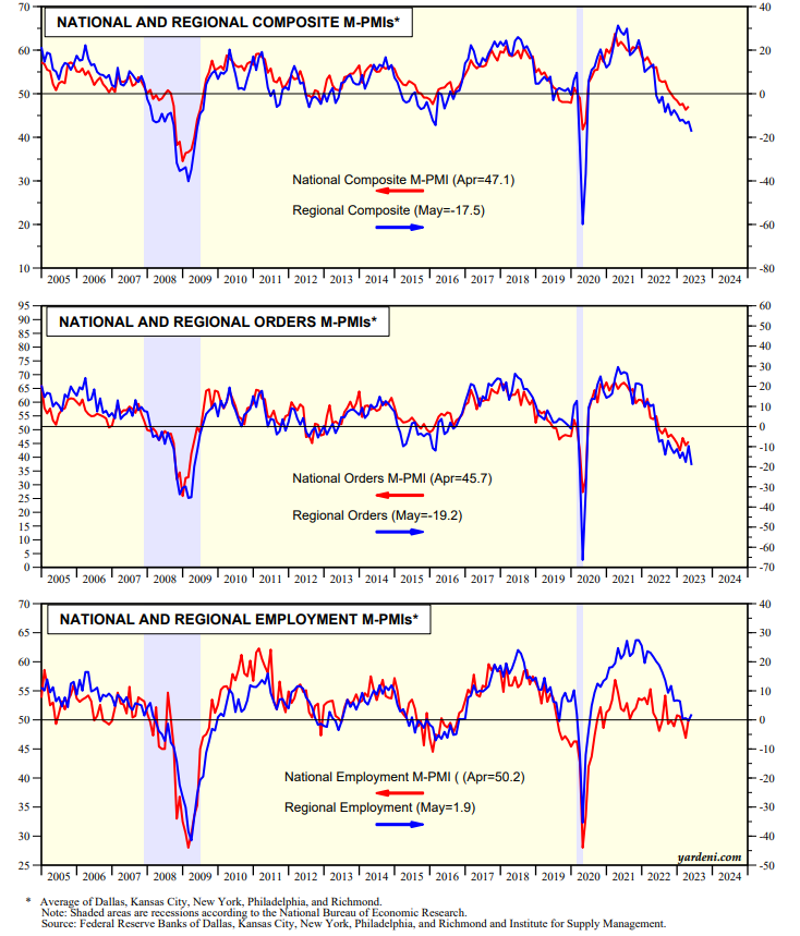 Perhaps the bond market responded to the Dallas Fed's May regional business survey released today, which was weak. So were the other four regional business surveys released earlier this month. The average of their business activity indexes fell to -17.5, suggesting that the national M-PMI (at 47.1 in April) might have fallen further below 50.0 in May (chart). The same can be said for the average of the regional new orders indexes and the comparable component of the M-PMI.