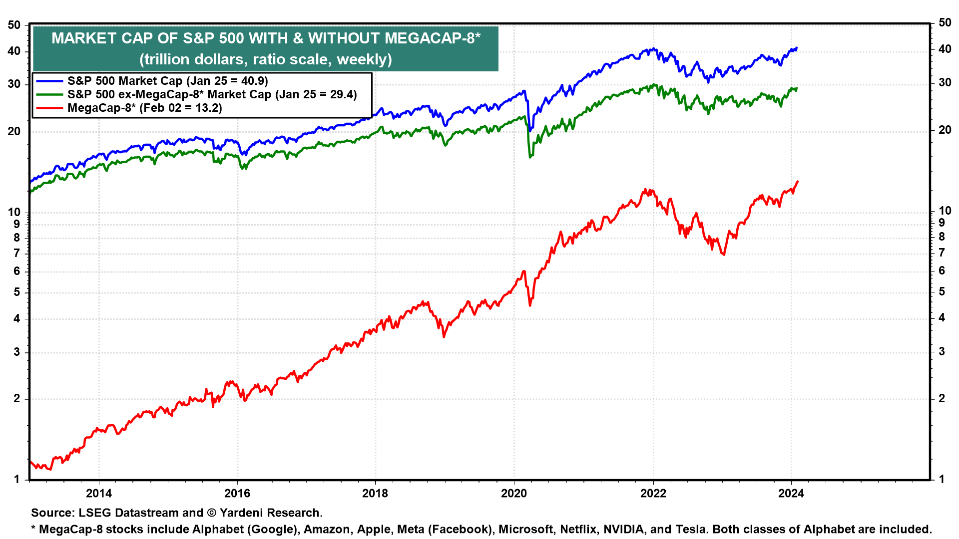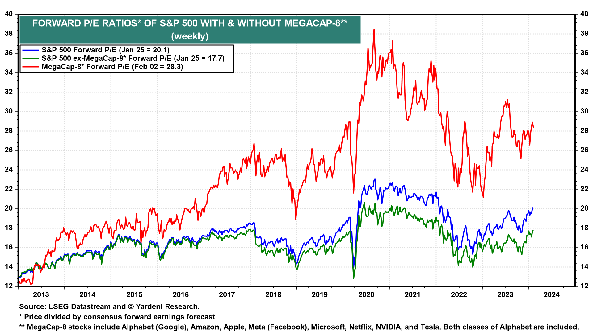 Through Friday’s close, the S&P 500 price index is up 4.0% ytd to a record high. The MegaCap-8 collectively has outperformed with a gain of 7.6%, also a record high (chart). Without the MegaCap-8 stocks, the S&P 500 would be up 2.5% ytd.