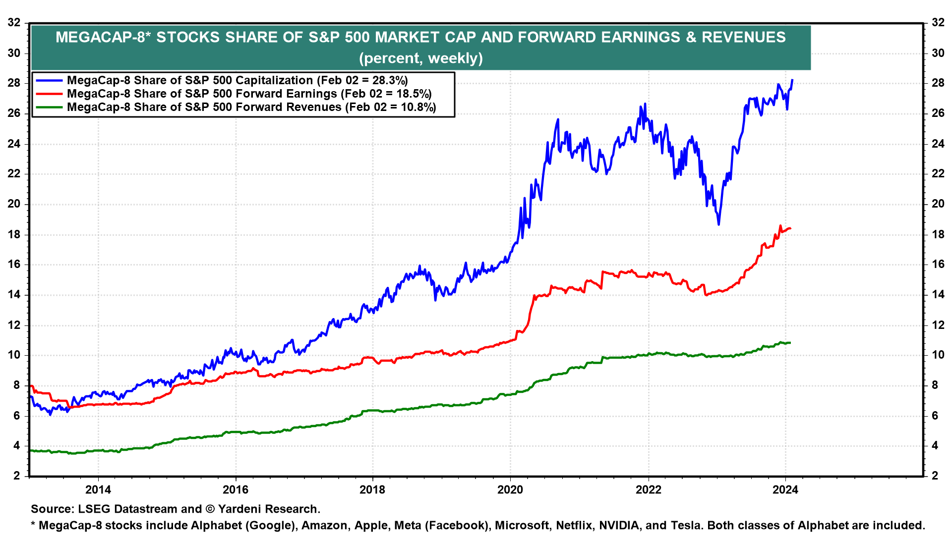 The MegaCap-8 now accounts for a record-high 28.3% of the S&P 500’s market capitalization (chart). They currently account for 18.5% of S&P 500 forward earnings and 10.8% of its forward revenues.
