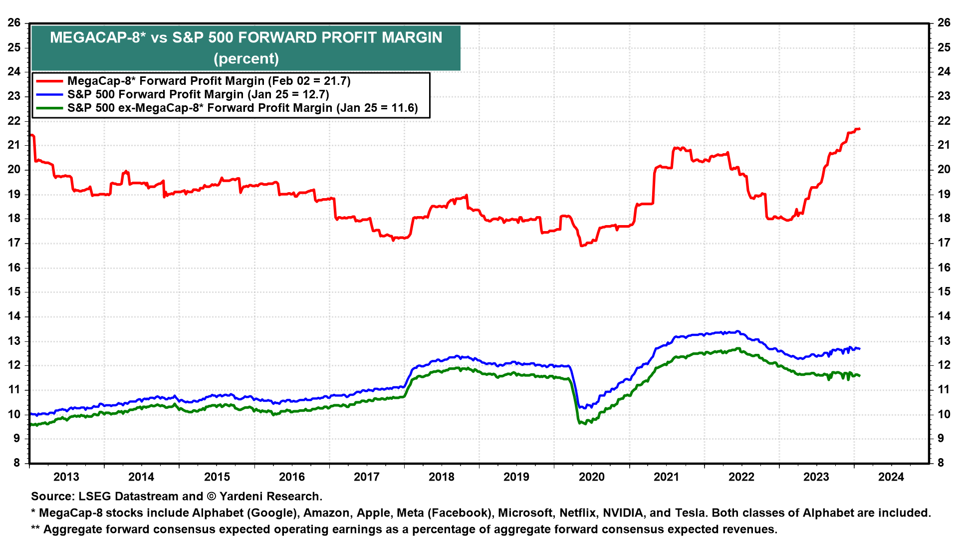 Back in early December, the MegaCap-8 had surpassed its prior record-high forward profit margin of 21.4%, registered nearly 12 years earlier on January 4, 2013! It has moved even higher since then to 21.7% in early February (chart).