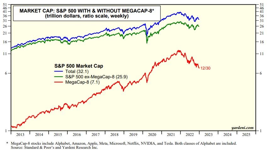 (1) Market capitalization. The combined market capitalization of the MegaCap-8 peaked at a record high of $12.3 trillion on December 27, 2021. Their big losses occurred in 2022, when their combined market cap fell 41.4%, or $5.0 trillion to $7.1 trillion (chart). The S&P 500 market caps with and without the MegaCap-8 fell 20.4% and 13.6% during 2022.