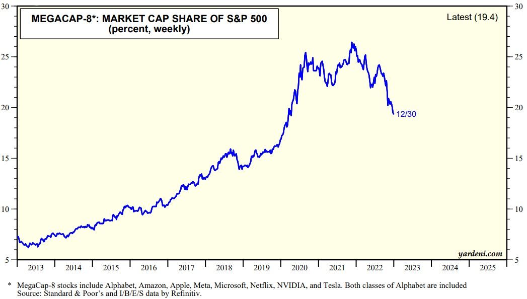 Each of the MegaCap-8 companies has had specific issues that weighed on their stock prices during 2022. They were especially vulnerable to the tightening of monetary policy which caused valuation multiples to fall. At the end of last year, their collective forward P/E was back down to 21.7. The forward P/Es of the S&P 500 with and without the MegaCap-8 are currently 17.1 and 16.1.