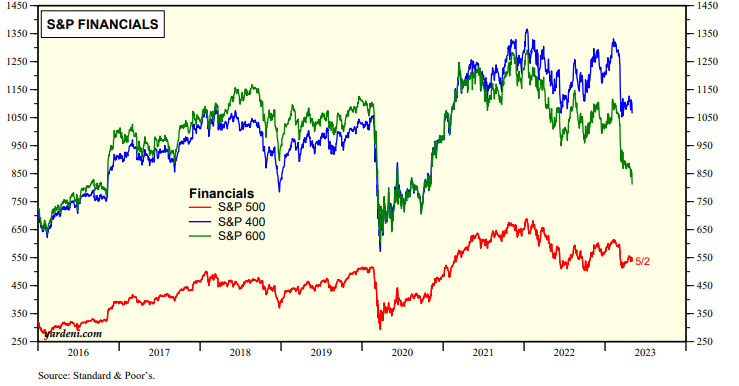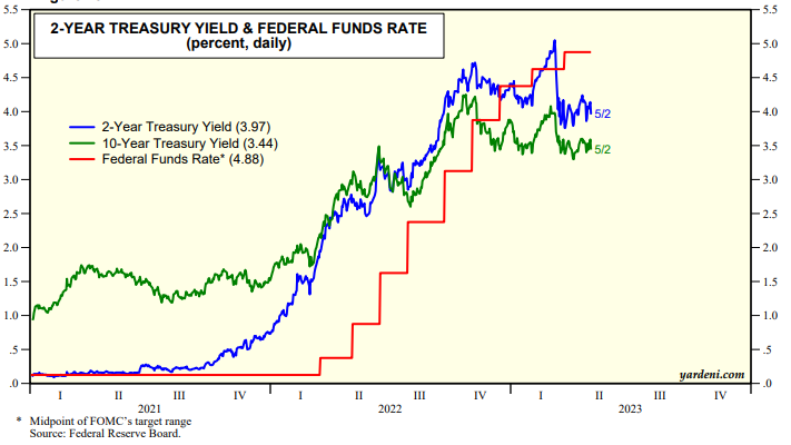 The 2-year Treasury note yield dropped 17bps today to 3.97% just as the FOMC is widely expected to raise the federal funds rate by 25bps t0 5.00%-5.25% tomorrow (chart). The markets are clearly signaling that the federal funds rate is already restrictive enough to slow economic growth and bring inflation down as evidenced by the banking crisis and the alarm bells ringing in the SMidCaps Financial sectors. By the way, the nearby futures price of a barrel of Nymex crude oil plunged $4 today.