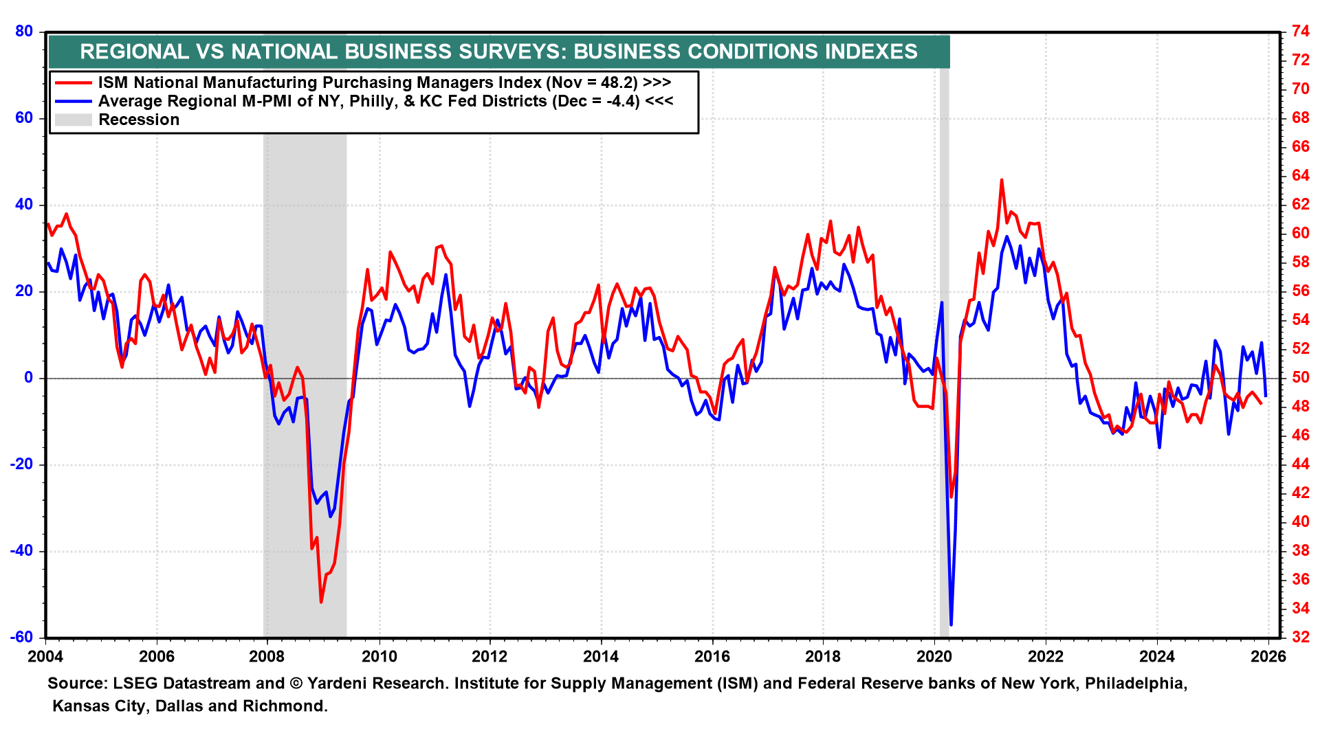 Another questionable data source is the monthly business surveys conducted by five of the regional Federal Reserve Banks. The three available ones for November suggest that the national M-PMI remains weak. That's probably correct. However, both the regional and national business surveys have been much weaker than the growth in real GDP for both goods and services.