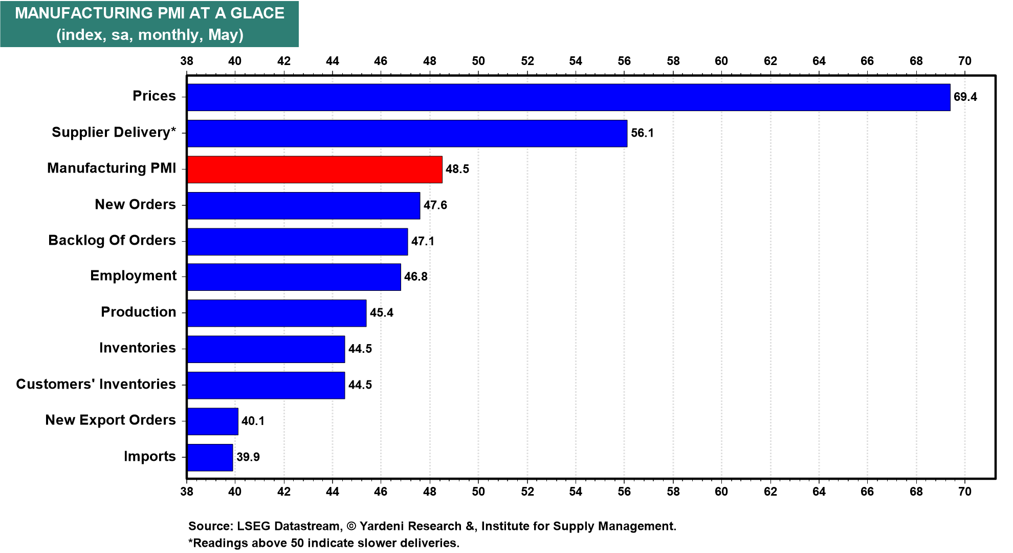 The weakest components of the M-PMI during May, not surprisingly, were new export orders and imports (chart). They clearly are reflecting the impact of Trump's Tariff Turmoil.