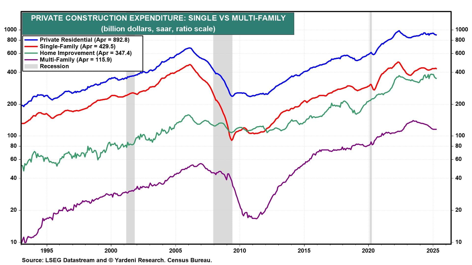 Interestingly, while new home sales and existing home sales have been weighed down by rising mortgage rates, construction spending on home improvements has remained strong in record high territory over the past three and a half years (chart). This is another source of the economy's resilience. Households are moving less and spending more to renovate their homes.