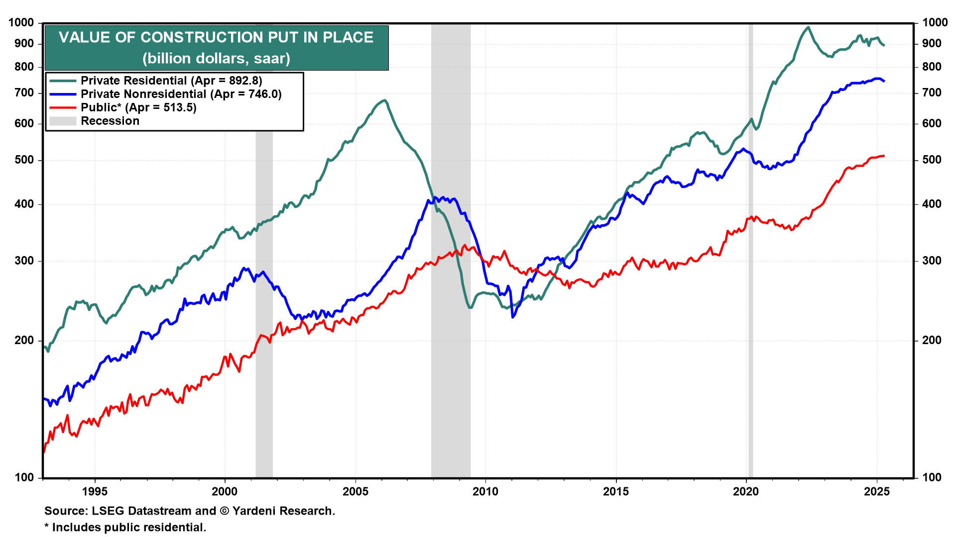 Over the past couple of years, the sluggishness in private residential construction has been offset by ongoing strength in private nonresidential construction and in public construction (chart).