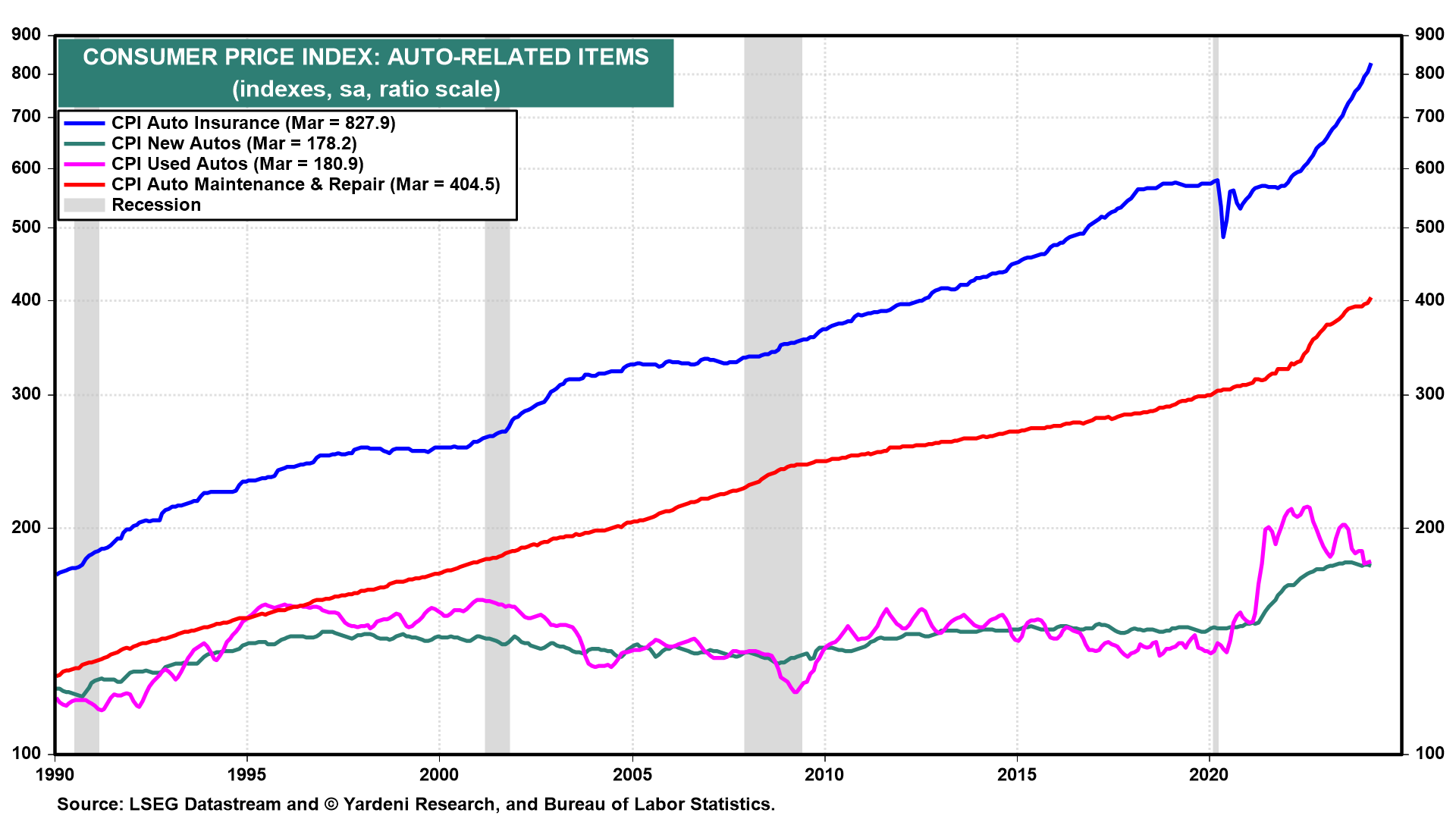 Since just before the pandemic during January 2020 through March of this year, the CPI indexes for new autos, auto maintenance & repairs, and auto insurance are up 21.0%, 34.8%, and 44.6% (chart). These all exceed the 20.6% increase in the headline CPI over this period. Why?