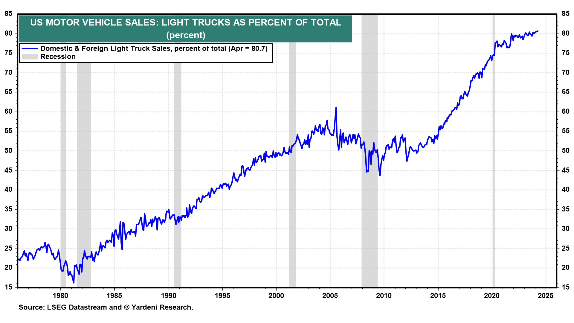 Americans are buying lots more expensive light trucks than passenger cars. They cost more to buy, maintain, repair, and insure than passenger cars. During February 2013, 50% of motor vehicle sales were light trucks. Their share of the market rose to a record 80.7% in April (chart). Is this really contributing to inflation? Or are more Americans prospering and choosing to splurge on their motor vehicles?