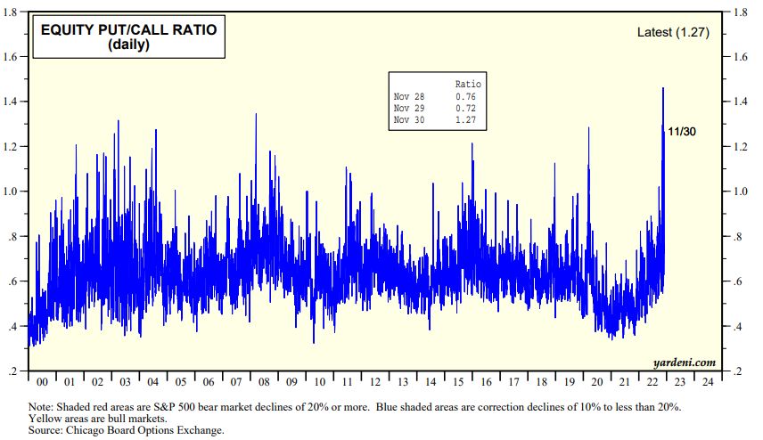 There was some really good news today for the bulls from a contrarian perspective. Investors Intelligence Bull/Bear Ratio remained depressed at 1.22 this past week and the equity put/call ratio jumped to 1.27 as put buying soared (charts).
