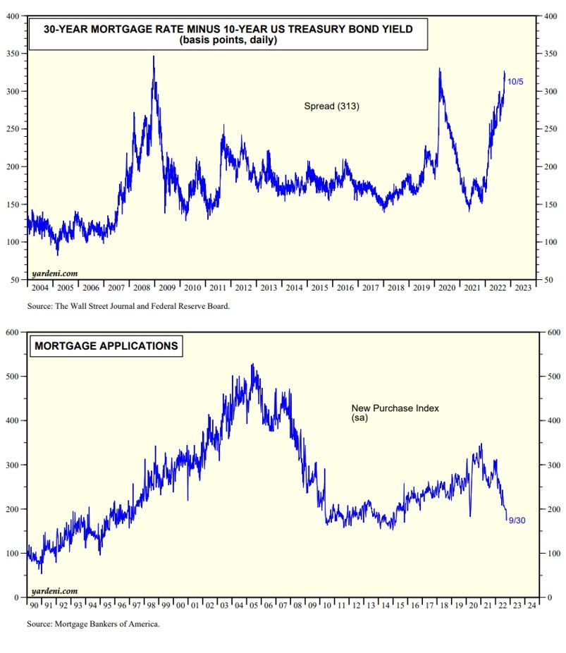 Have Powell and his colleagues been watching the housing and mortgage markets? Mortgage rates continued to surge higher this week, crossing 7% on the 30-year fixed to 7.08%. That is the highest rate in just under 20 years. They've soared faster than the 10-year Treasury bond yield because the spread between the two has been widening dramatically as a result of the Fed's QT2 (chart below). "Feddie" intends to get out of the mortgage business. Mortgage applications to purchase a home are plummeting. They are down 29% from the same week one year ago (chart below). Housing starts and home sales are heading south fast.
