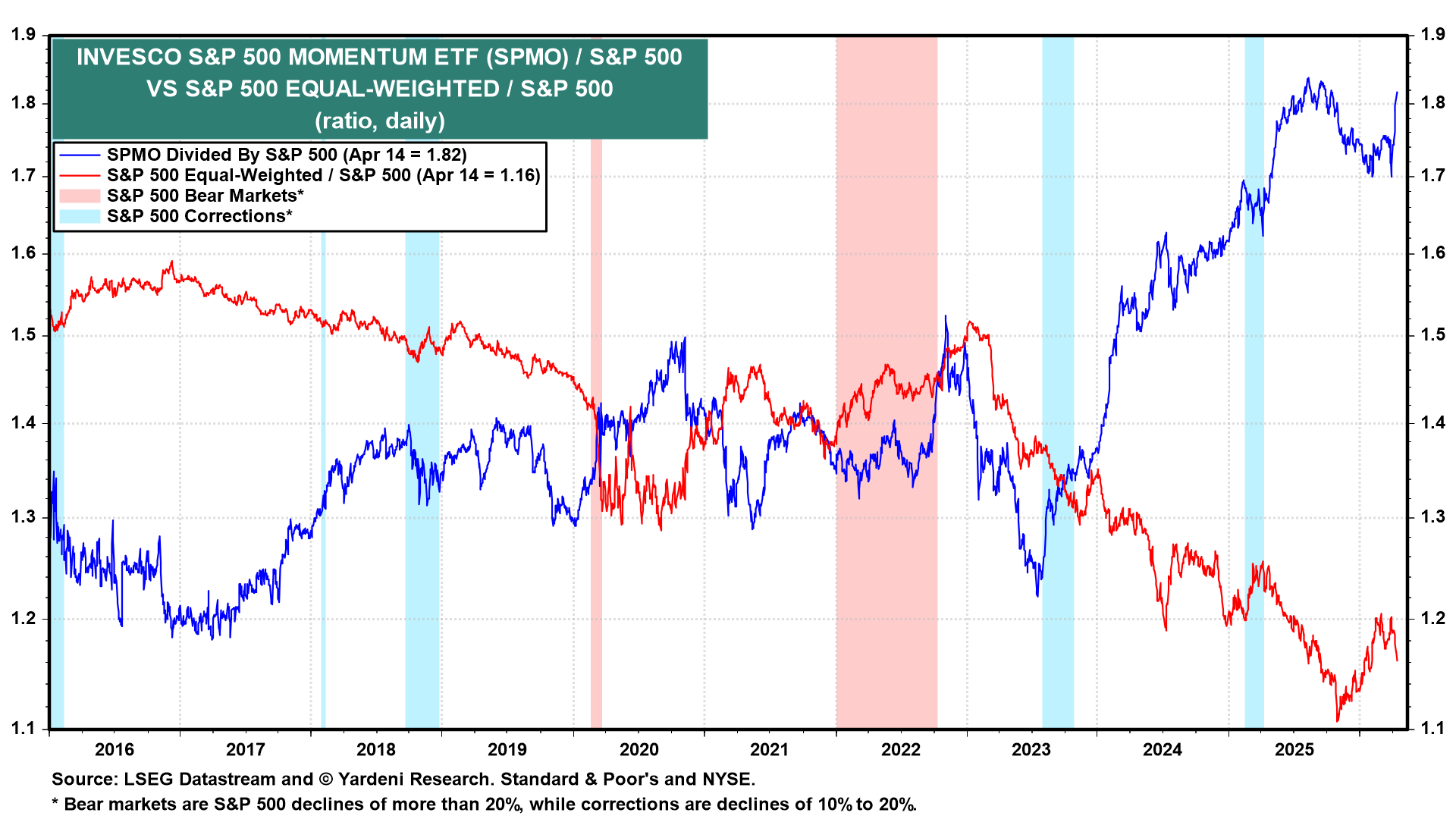 It has also been another momentum-led rebound, similar to last year's explosive rally that started on April 9, when President Donald Trump postponed his Liberation Day tariffs (chart). The S&P 500 equal-weighted index has underperformed the S&P 500 market-weighted index so far. Since the latest pullback bottomed on Monday, March 30, the former and the latter have risen 6.1% and 9.8%, respectively. Over this same period, the MAGS ETF is up 14.8%, while the XMAG ETF is up 8.1%.