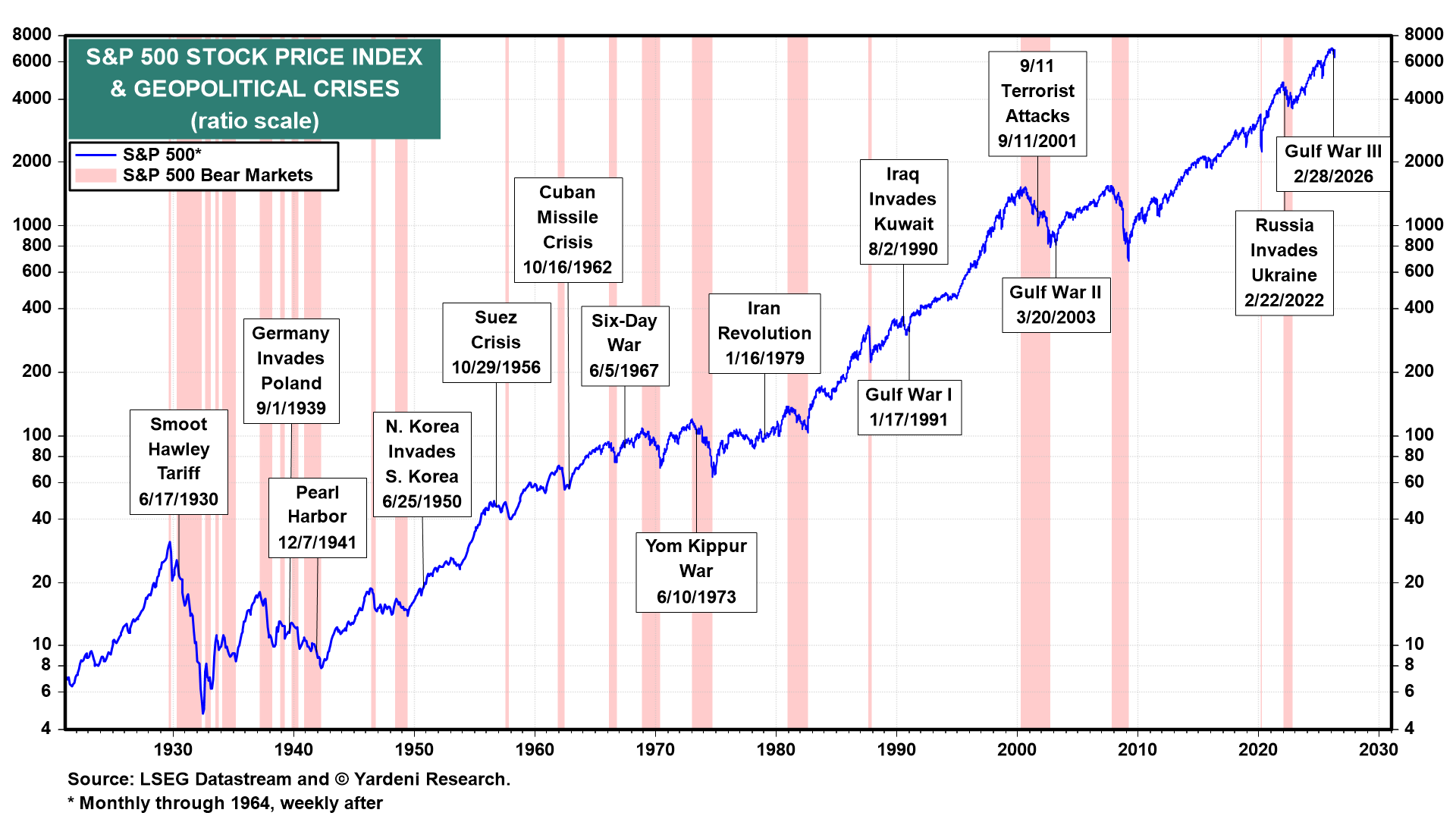 The S&P 500 is now up 1.3% since Friday, February 27, the day before Gulf War III started (chart). So as far as the stock market is concerned, the war is over until further notice. The index will be at a new record high tomorrow if it increases by more than 11.22 points! It has been yet another V-shaped buy-the-dip recovery in the S&P 500. It has also been another buying opportunity arising from a geopolitical crisis, as we previously observed when we called the March 30 bottom the following day.