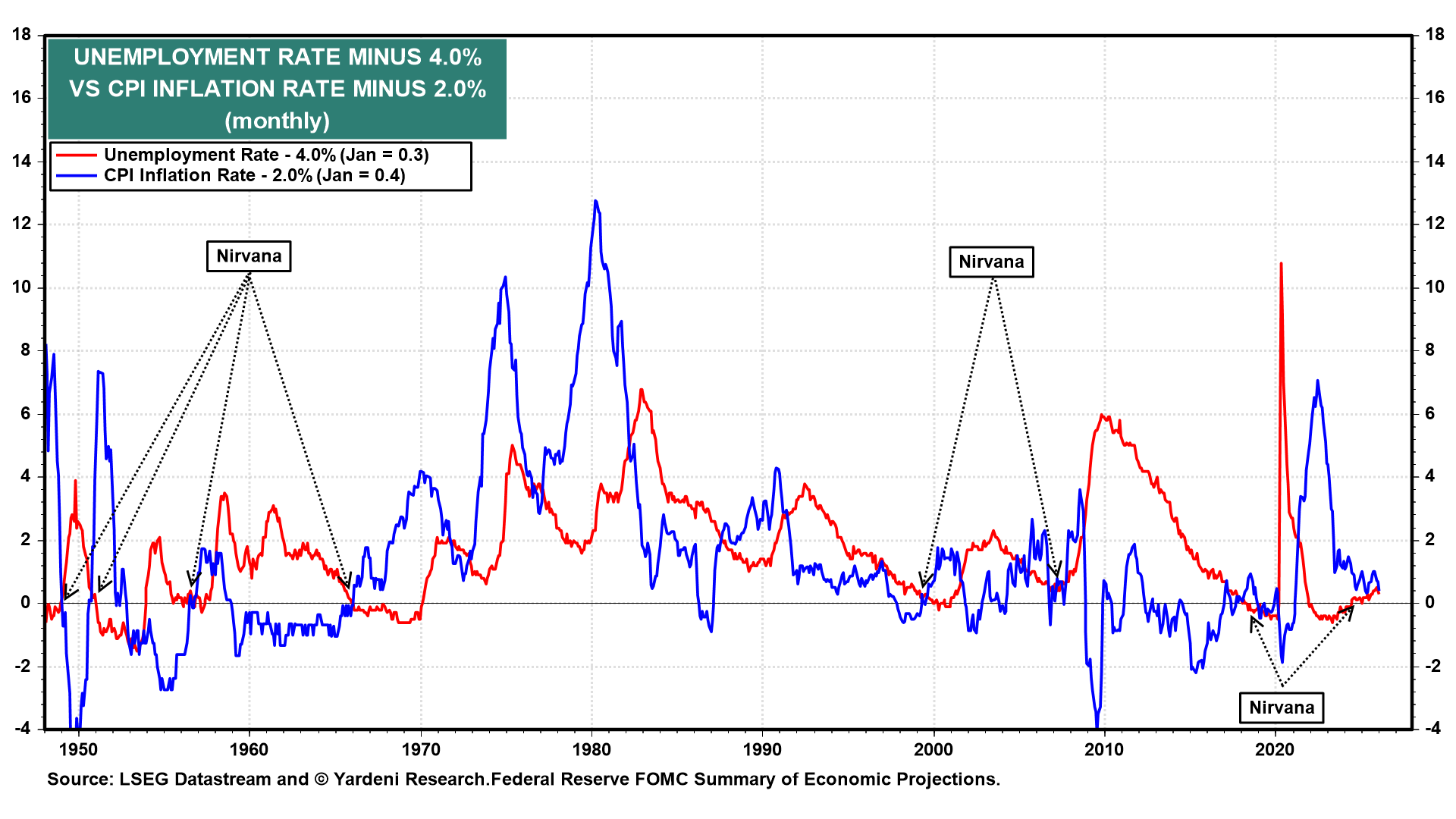 The Fed achieved its congressional dual mandate in January. The unemployment rate fell to 4.3%, and the CPI inflation rate was down to 2.4% y/y. Those round down to what we call “Nirvana” readings, i.e., the low unemployment level of 4.0% and the Fed’s inflation target of 2.0% (chart). Fed officials should celebrate and go on a long vacation. They can leave the federal funds rate (FFR) alone at its current 3.50%-3.75%. By their own definition, that must be the "neutral" FFR, the level that’s consistent with full employment and stable prices. Why mess with success?