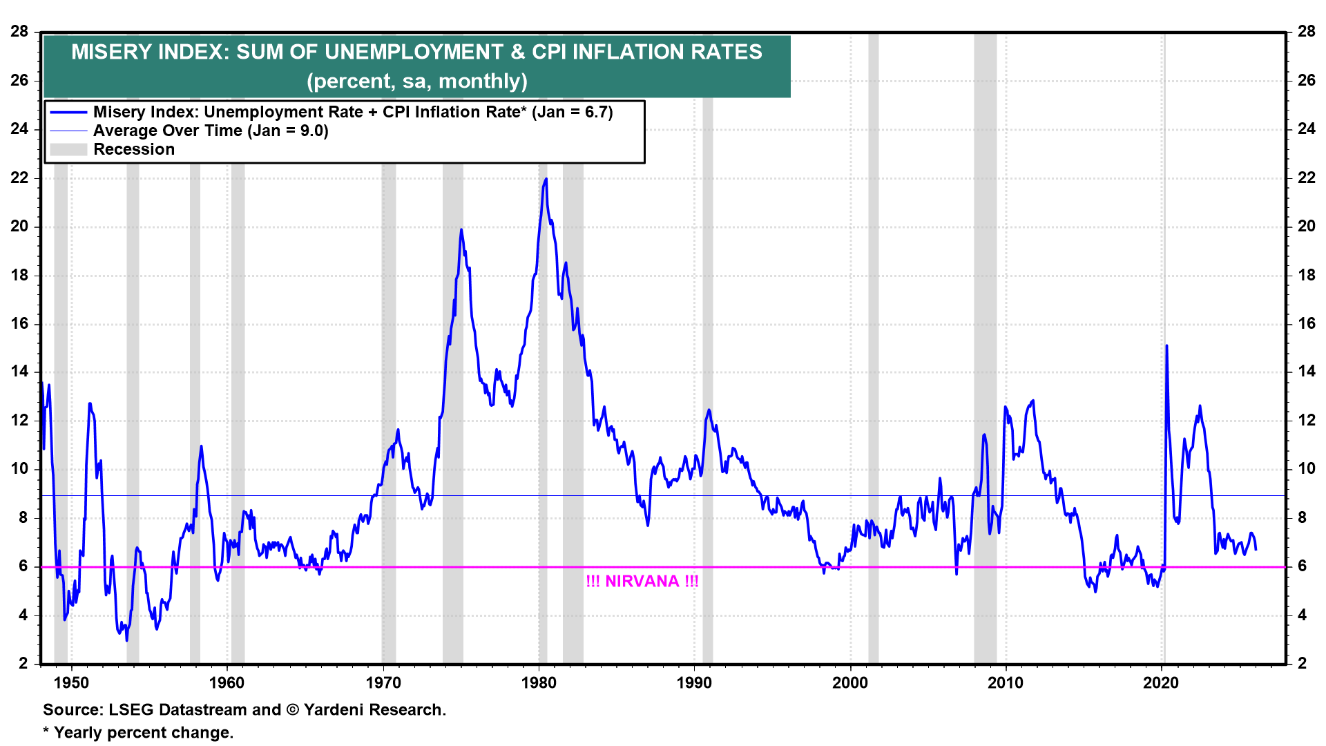 The Misery Index is the sum of the unemployment and inflation rates (chart). It was 6.7% in January, only 0.7 percentage points above the Nirvana sum and well below the long-term average of 9.0% (chart). It has been fluctuating around 7.0% since June 2023. We've been in Nirvana for a while!